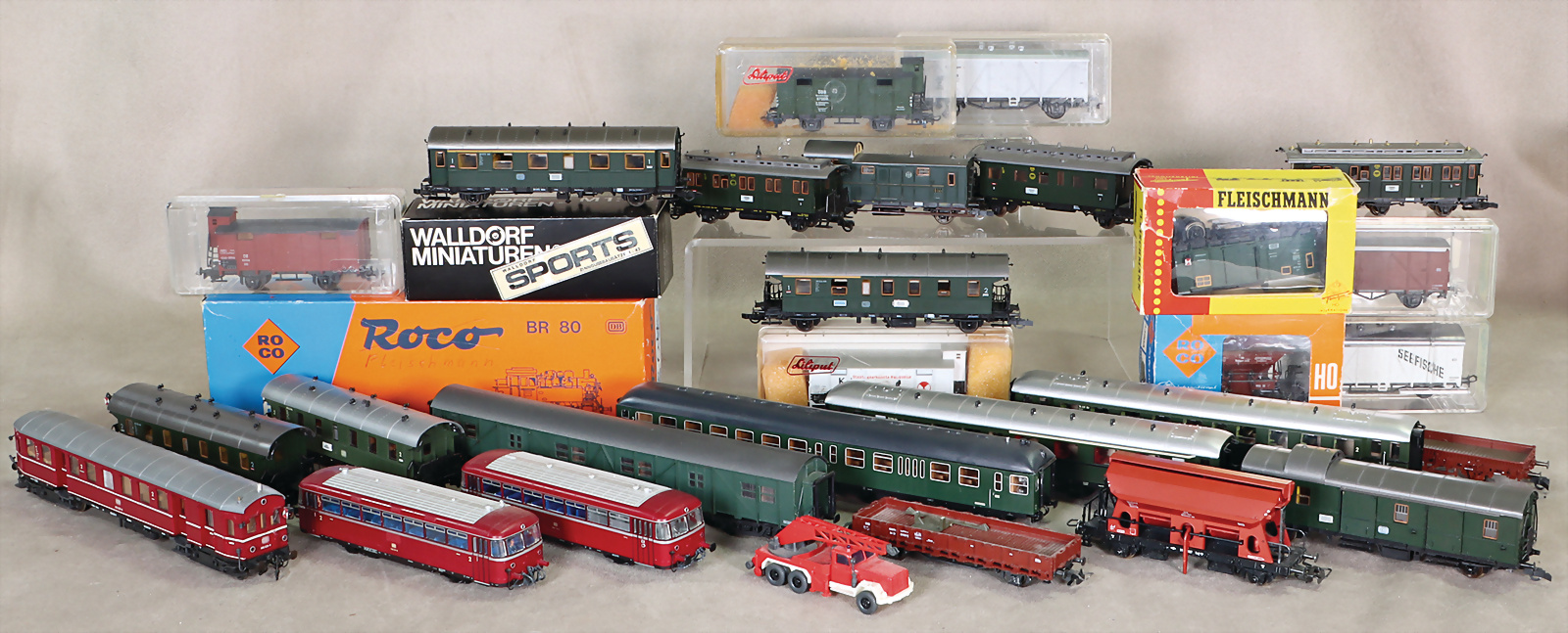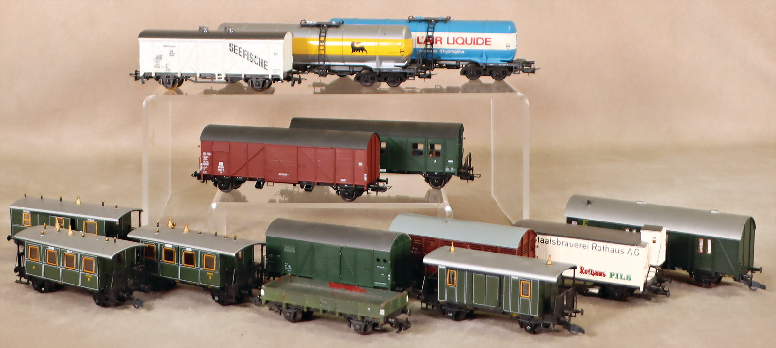Konv. H0, Güter- u. Personenwagen, untersch. Hersteller, darunter ROCO, FLEISCHMANN, u.a., meist guter Zust.