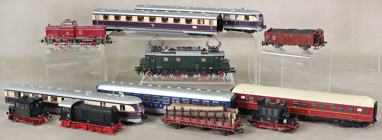 Konv. Güter- u. Personenwagen, untersch. Hersteller, Diesel-Lok, Elektro-Lok, 1 Triebwagen, LILIPUT, ohne Kart., meist guter Zust., techn. nicht gepr.