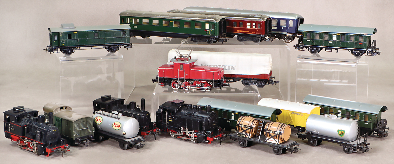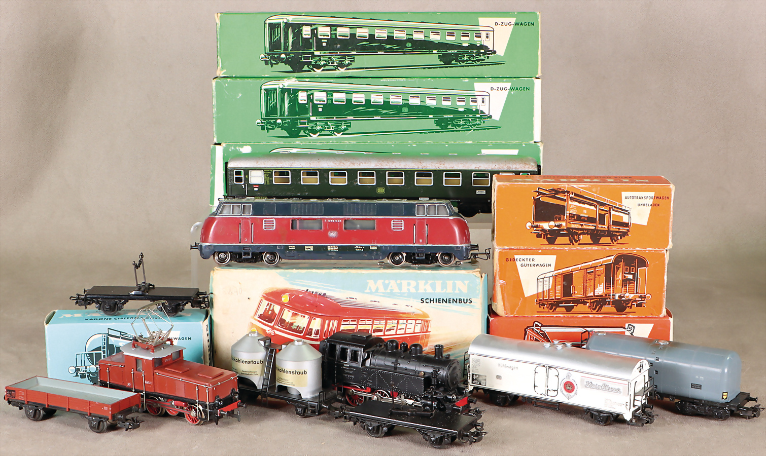 Konv. H0, MÄRKLIN, Elektro-Rangierlok, TM 800, V 200, 1 Schienenbus im Orig.-Kart., 3x 4-achsige Personenwagen, einige Güterwagen, teils im Kart., meist guter Zust., teils bespielt