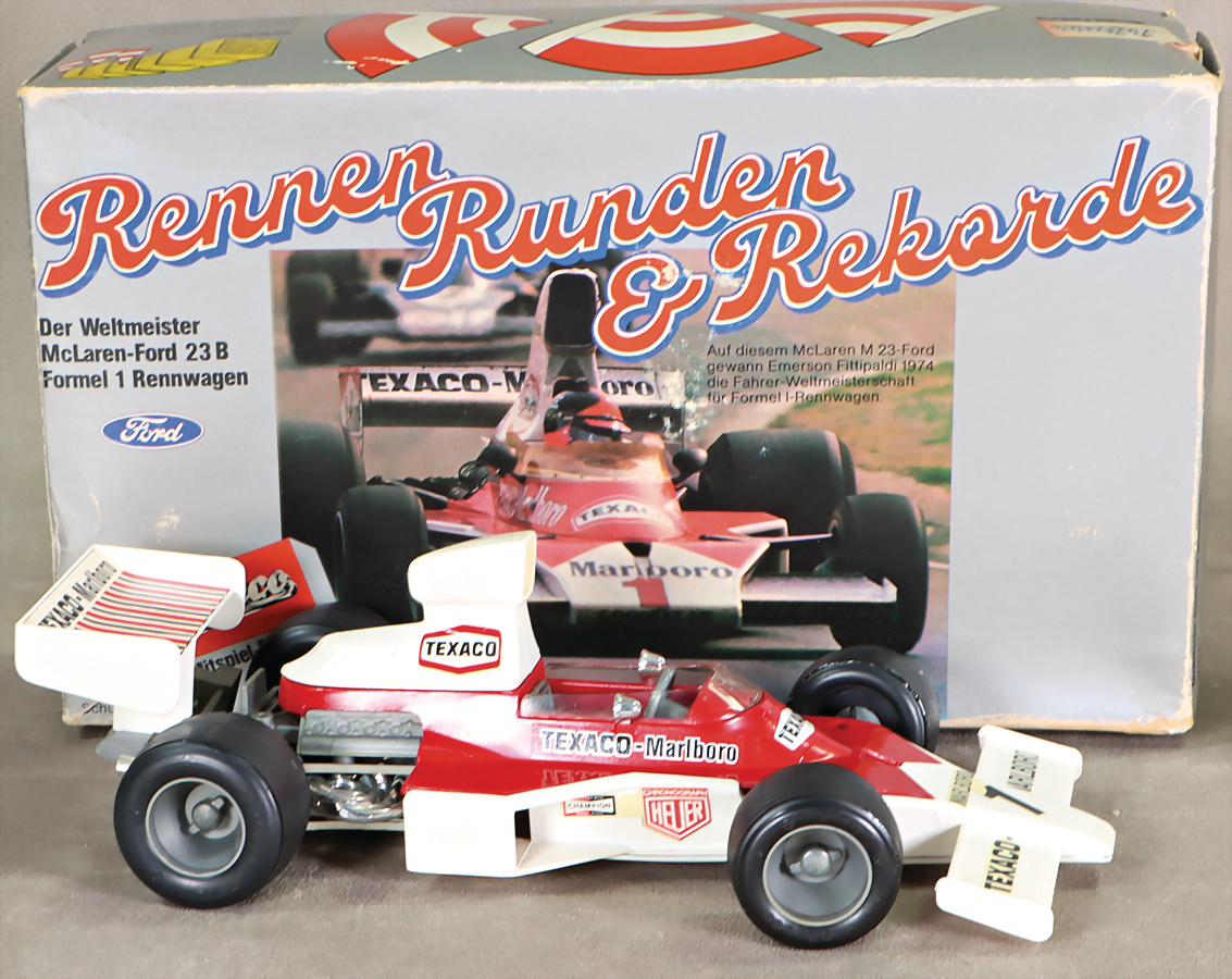 „Runden u. Rekorde der Weltmeister McLaren-Ford“, 23B, Formel 1 Rennwagen, Artikel-Nr. 356179, neuw. im Orig.-Kart., 1 Kratzer im Frontbereich