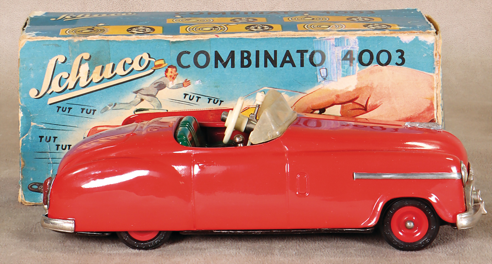 Combinato, 4003, Uhrwerkantrieb, Hupe, intakt, US-Zone, Lackfehler an der Bodenplatte, Frontscheibe ergänzt, Orig.-Kart. verschlissen