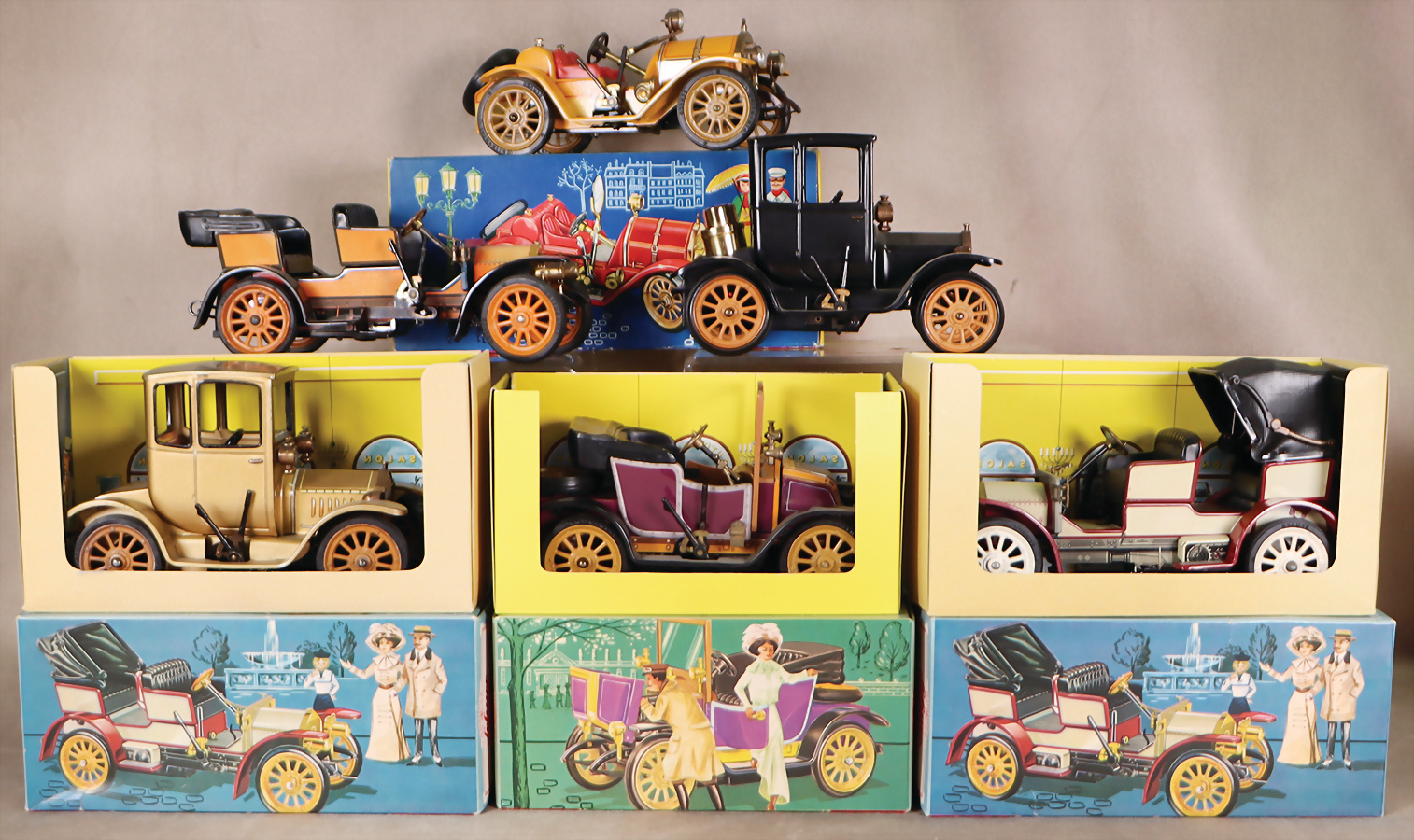 Konv. Oldtimer, Mercedes Typ 35J, 1913, neuere Produktion, neuw. im Orig.-Kart., Mercedes-Benz Simplex, 1902, neuere Produktion, neuw. im Orig.-Kart., Renault 6CV, 1911, neuere Produktion, neuw. im Orig.-Kart., SCHUCO Ford, 4014 mit Musikspielwerk (intakt), Kart. zu Mercedes Simplex, Mercedes Simplex Modell 1902, ohne Kart., Uhrwerk intakt, neuere Produktion, Oldtimer, mit Feuerzeug, Consul, guter Zust.