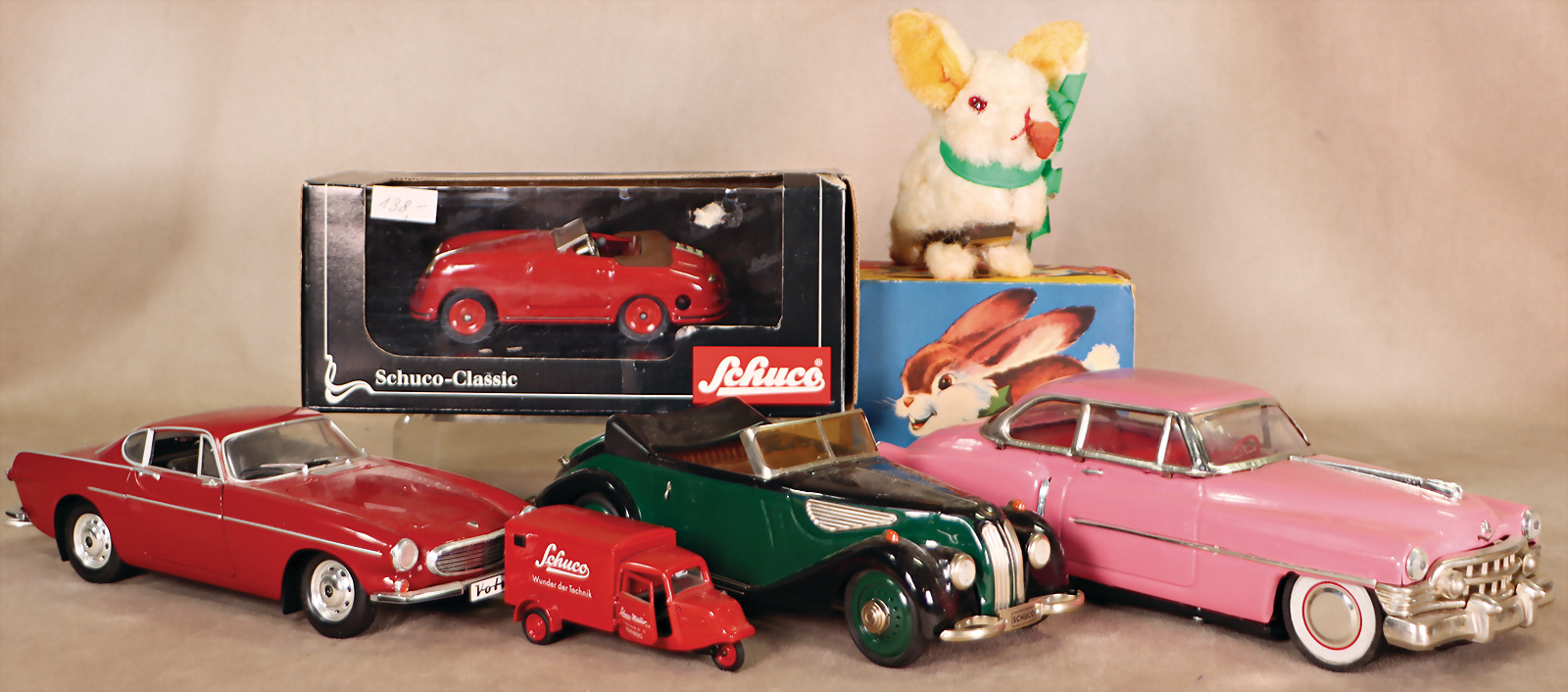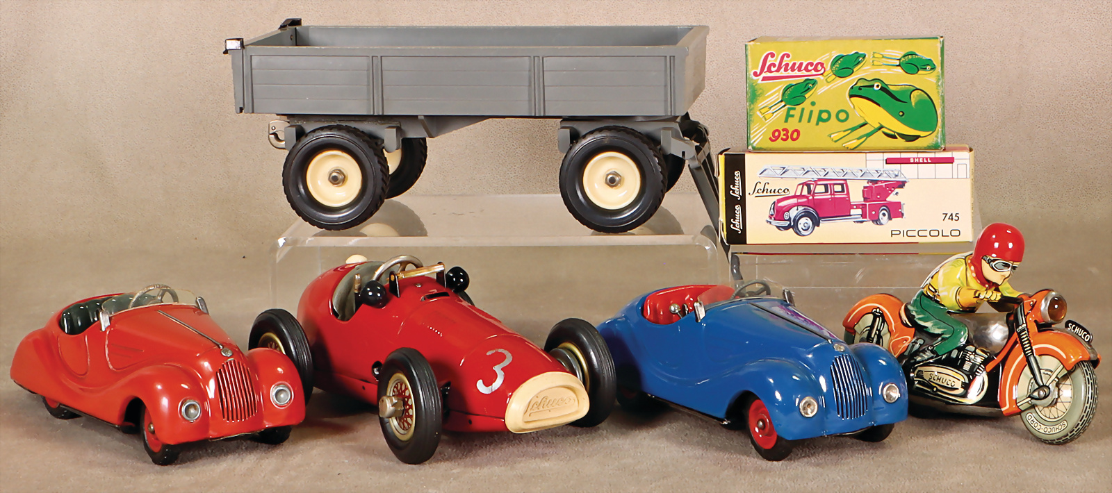 Grand-Prix-Racer, 1070, Made in US-Zone, Rennwagen, guter Zust., Uhrwerk intakt, Examico, 4001, Uhrwerk intakt, wohl neu lackiert, SCHUCO Motodrill, 1006, Uhrwerk intakt, wohl nicht alle Teile original, SCHUCO Piccolo, neuere Produktion, 1 Anhänger, Hersteller?, für SCHUCO Lastwagen, SCHUCO, Frosch Filitheo, sehr guter Zust., im Kart.