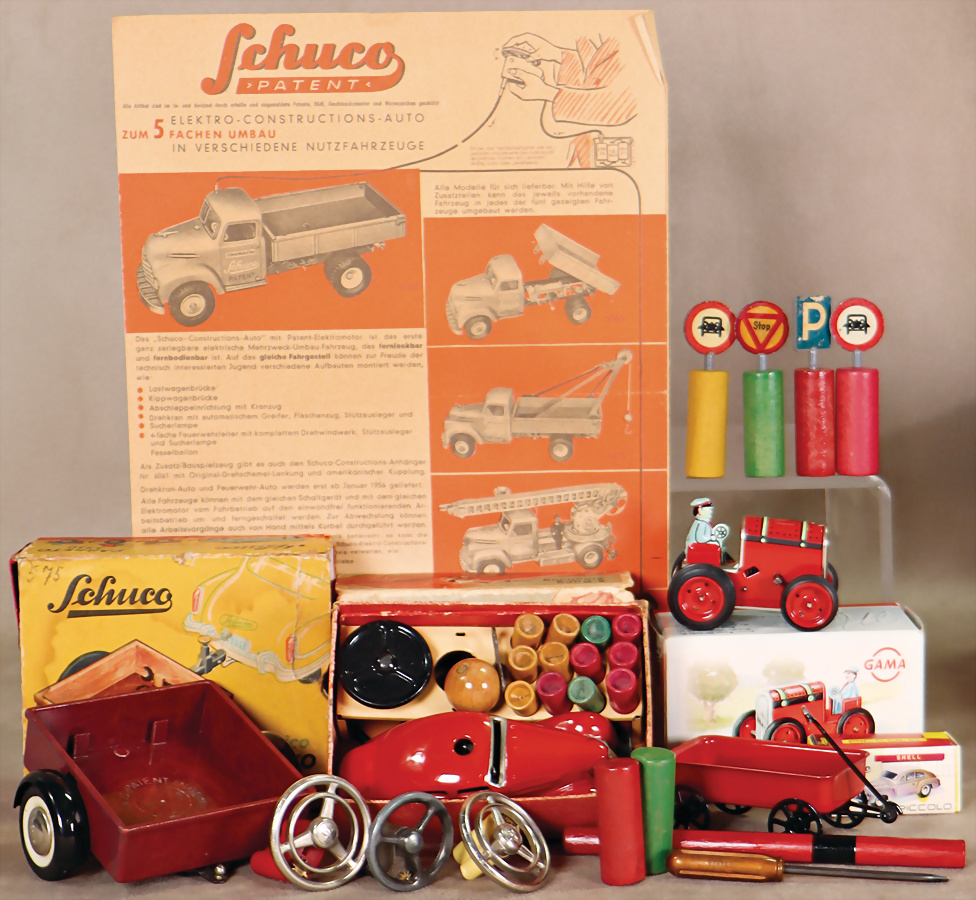 Fernlenkauto, 3000, guter Zust., Uhrwerk intakt, im Orig.-Kart., mit Zubehör, Kart. verschlissen, Carreto, 5330, Anhänger, sehr guter Zust., mit Kartonhülle, Prospekte, Kleinteile, Zubehör, interessante Fundkiste