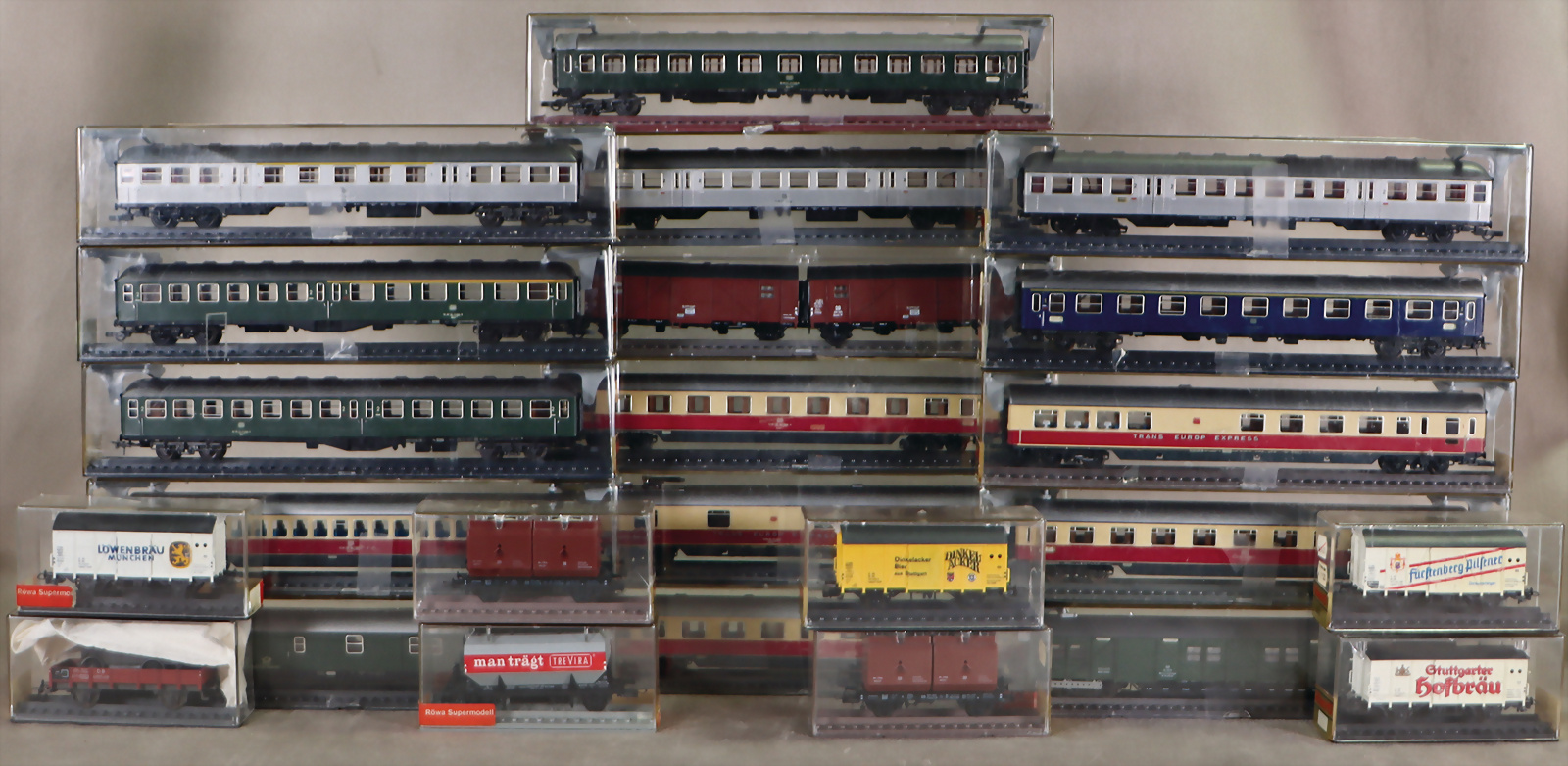Konv. Güter- u. Personenwagen, H0, RÖVA u.a., 24 Teile, meist guter Zust., im Kart.