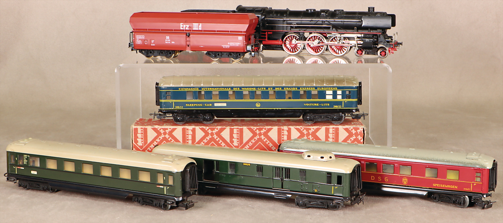 Konv. H0, F 800, Schlepptender-Lok, 2 C-1, Guss, 4-achsiger Personenwagen, 346/1, Gepäckwagen, 346-4, Speisewagen, 346/2, internationaler Schlafwagen, 346/3J, 1 Schüttgutwagen, sehr guter Zust.