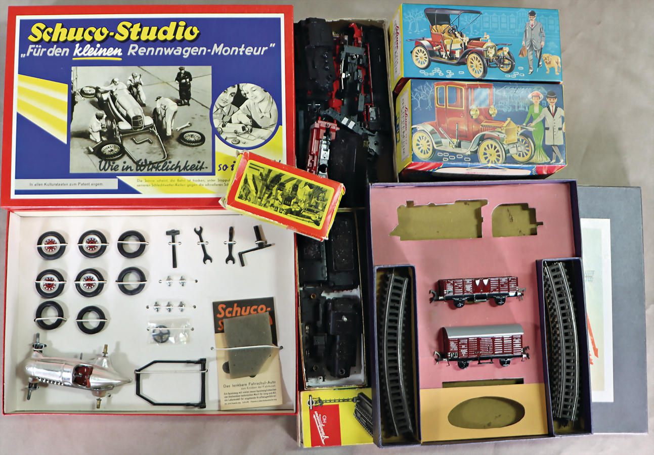 Fundkiste, FLEISCHMANN, Orig.-Kart., ohne Lok, Ersatzteile, untersch. Hersteller, 1 Fleischmann Signale, 1 SCHUCO Studie, Rennwagen-Monteur, neuere Produktion, neuw. im Orig.-Kart.5, 2x SCHUCO Oldtimer, neuw. im Orig.-Kart.