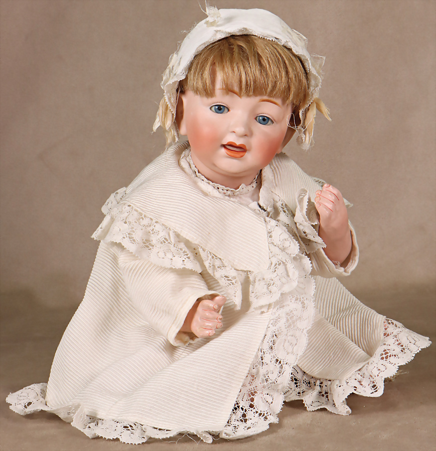 Porzellan-Charakter-Puppe, gem. 211, 31 cm, Kurbelkopf, blaue Schlafaugen, off./geschl. Mund, Sitzbaby-Körper mit untersch. Handhaltung u. leicht abstehendem Zeh, Gipsdeckel, alte Mohair-Perücke, Kleidung alt oder aus alten Stoffen genäht