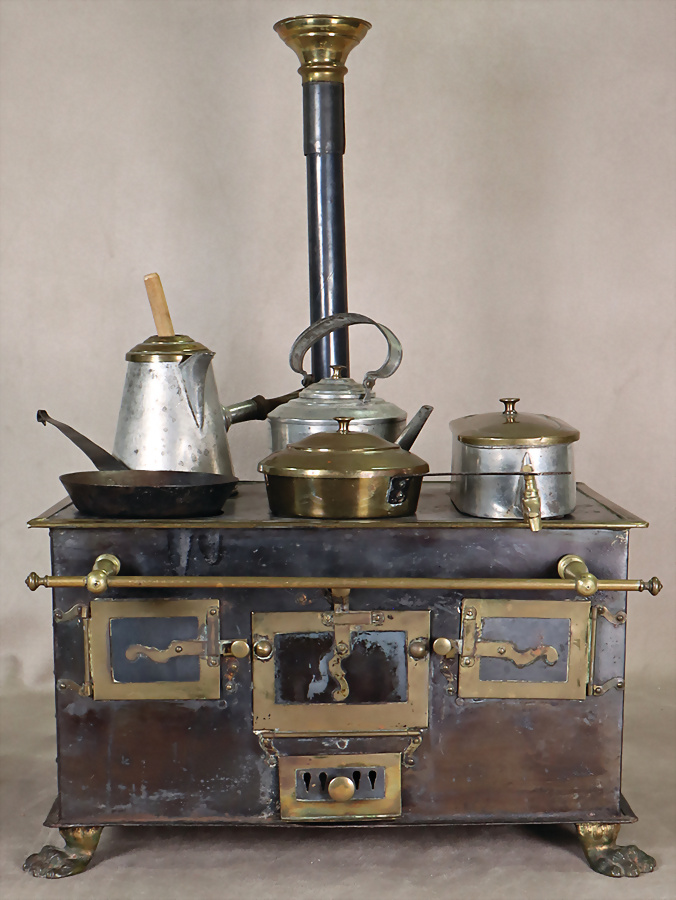 Puppenküchenherd, um 1900, B: 35 cm, Löwentatzenfüße, Messinggriffstange, mit Brenner, Wasserschiff, Wasserkessel, Kakaokocher, ohne Quirl, Pfanne mit Deckel, 1 Topf fehlt, durch Pfanne ergänzt, Schornstein nicht original