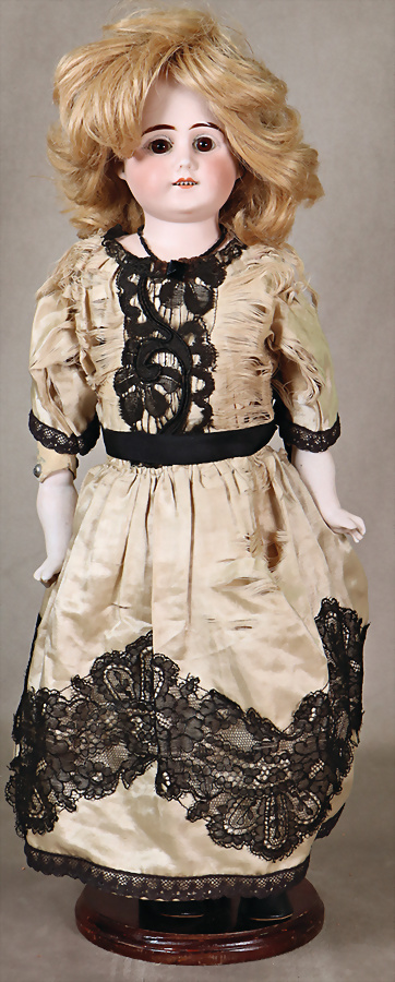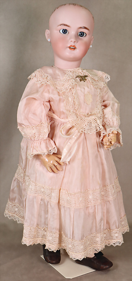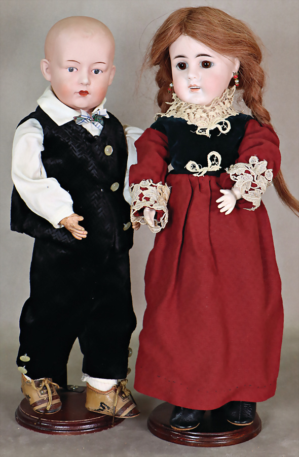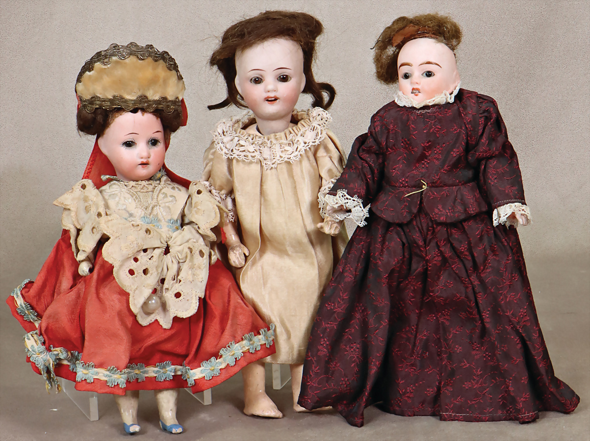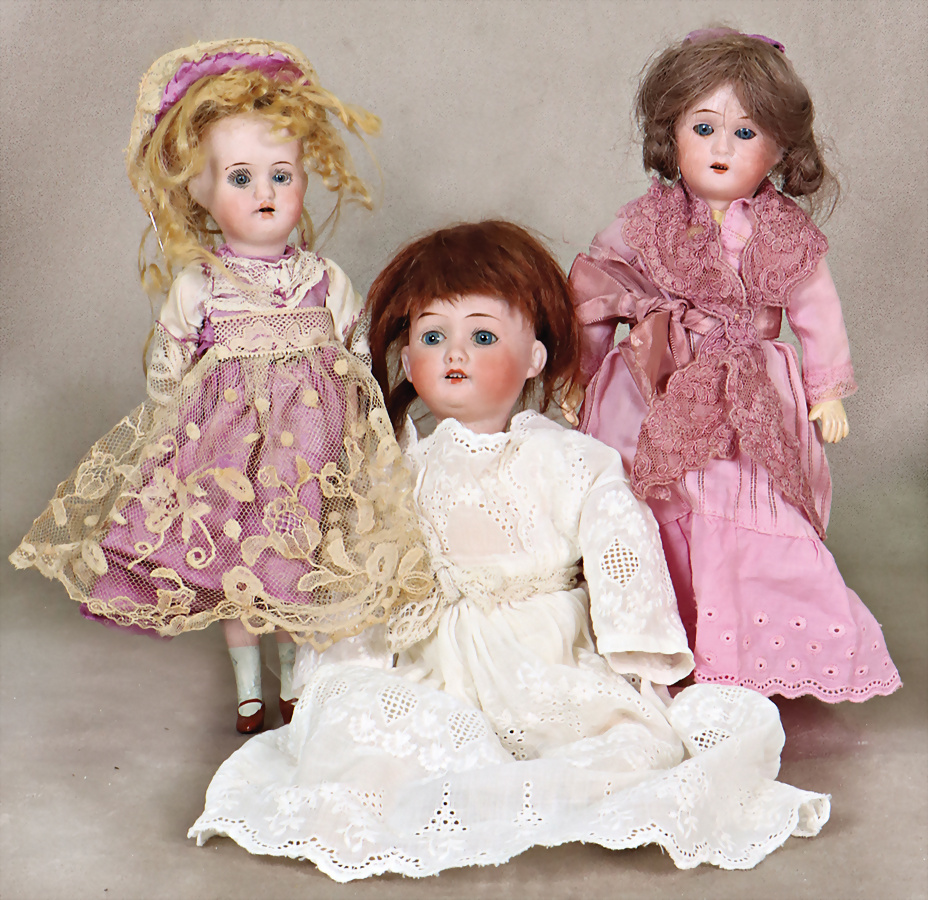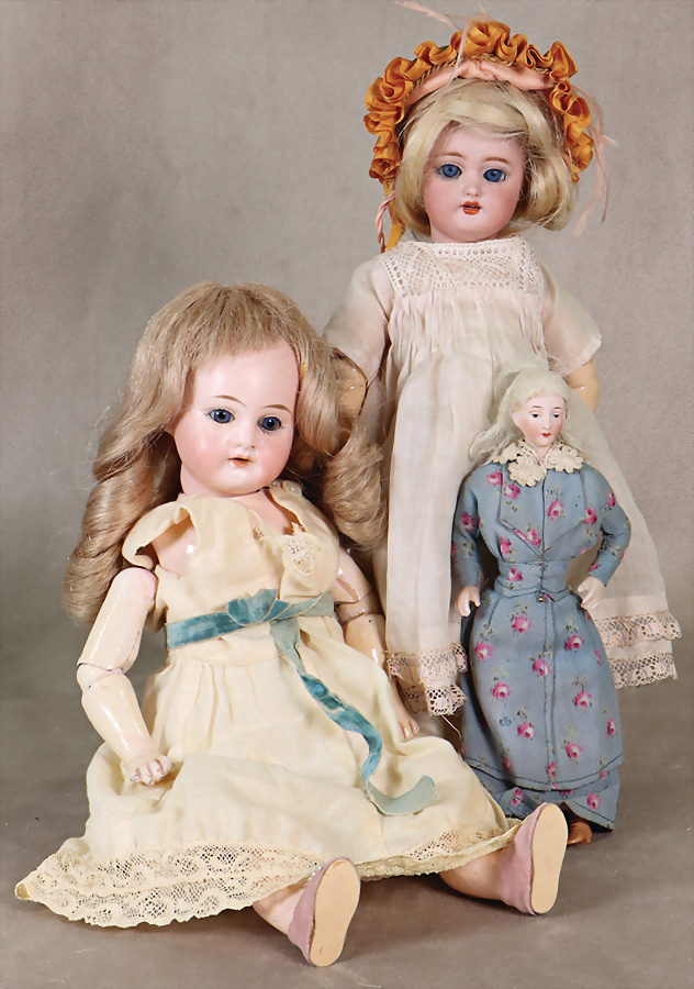 3 Teile, Puppen, SIMON & HALBIG, 1879, 25 cm, Kurbelkopf, blaue Schlafaugen, off. Mund, oben Zähne, Gliederkörper mit festen Handgelenken, Perücke neuer, wurde fest aufgeklebt, von außen keine Risse erkennbar, alte Kleidung u. Schuhe, ARMAND MARSEILLE, 1894, DEP, 31 cm, Kurbelkopf, blaue fest einges. Glasaugen, off. Mund, oben Zähne, Gliederkörper mit festen Handgelenken, Gummis locker, Perücke neuer, Puppenstuben-Puppe, 17 cm, Porzellan-Brustblattkopf, -Arme u. –Beine