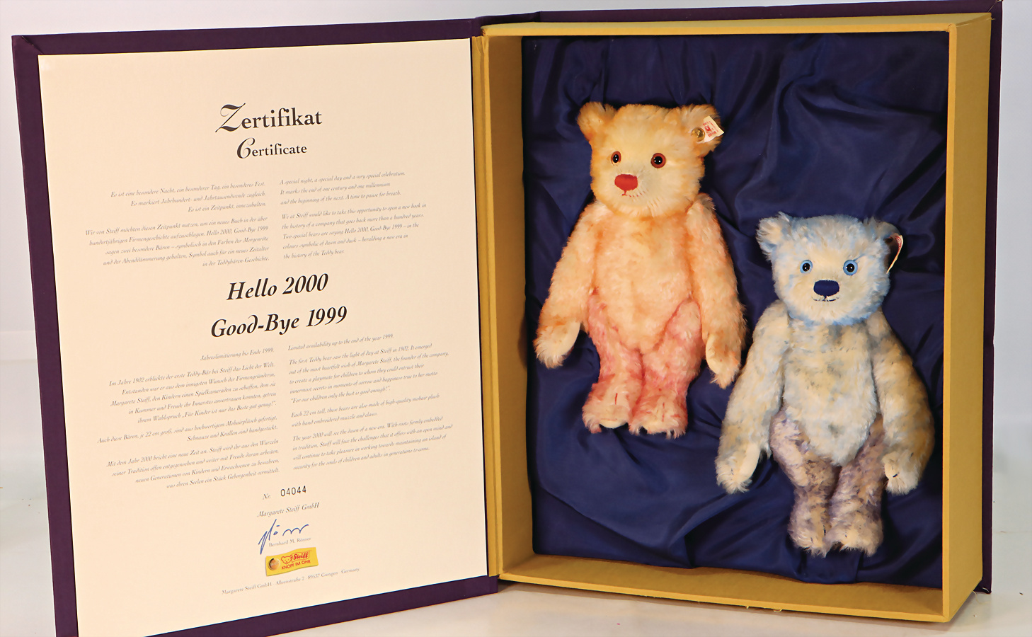 Hello 2000 / Goodbye 1999, 2 Bären mit Knopf u. weißer Fahne, mit Zertifikat, beide in einem Kart.