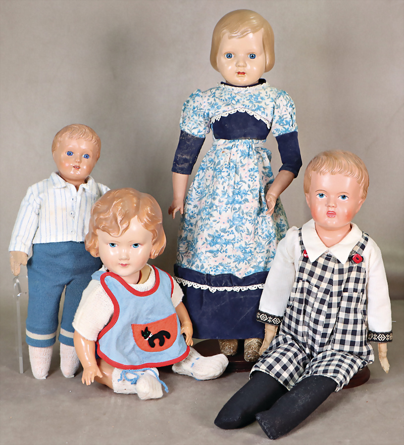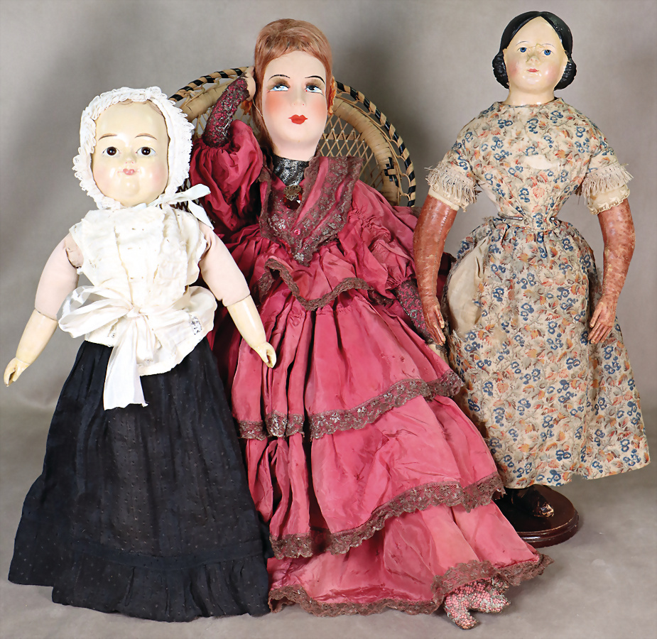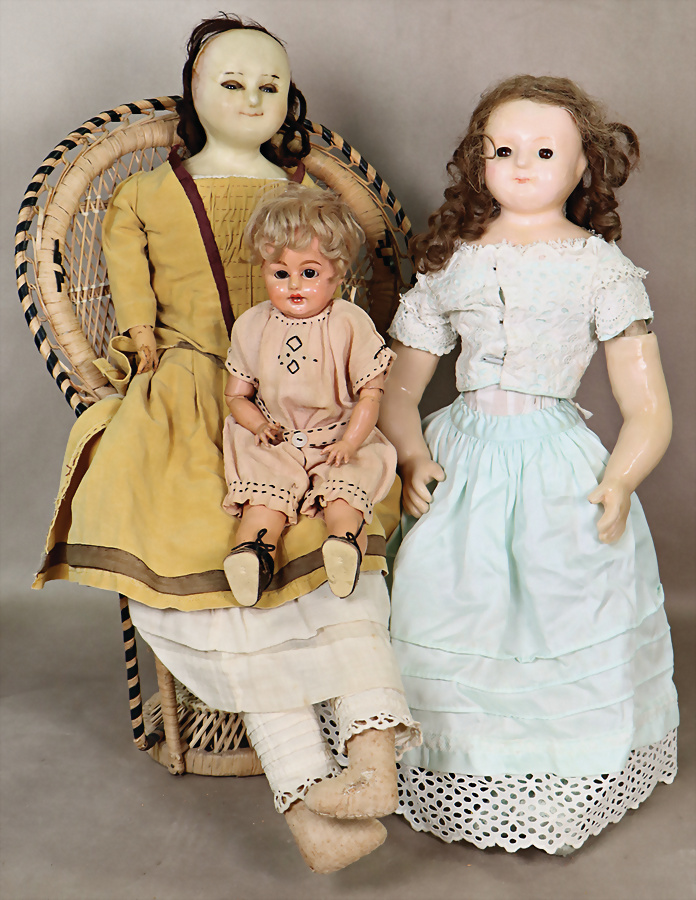 Wachs überzogene, Papiermaché-Brustblattkopf-Puppe, England, 58 cm, braune fest einges. Glasaugen, Stoffkörper, Wachsarme u. –beine, einige Stellen ausgebessert, Wachs überzogene Papiermaché-Brustblattkopf-Puppe, 68 cm, braune Schlafaugen, geschl. Mund, einges. Mohair, Stoffkörper, Lederunterarme, 1 paar Finger fehlen, Spannungsrisse im Gesicht, Papiermaché-Brustblattkopf-Puppe, 31 cm, Mohair-Perücke, fest aufgeklebt, wurde nicht entfernt, braune Schlafaugen, off. Mund, unten Zähne, Stoffkörper, Masse-Arme u. –Beine, Arme gegliedert