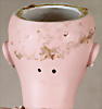 Porzellan-Brustblattkopf-Puppe, gem. 6, 47 cm, braune fest einges. Glasaugen, off. Mund, oben Zähne, durchst. Ohren, Lederkörper, Porzellan-Unterarme, Finger an 1 Hand fehlen