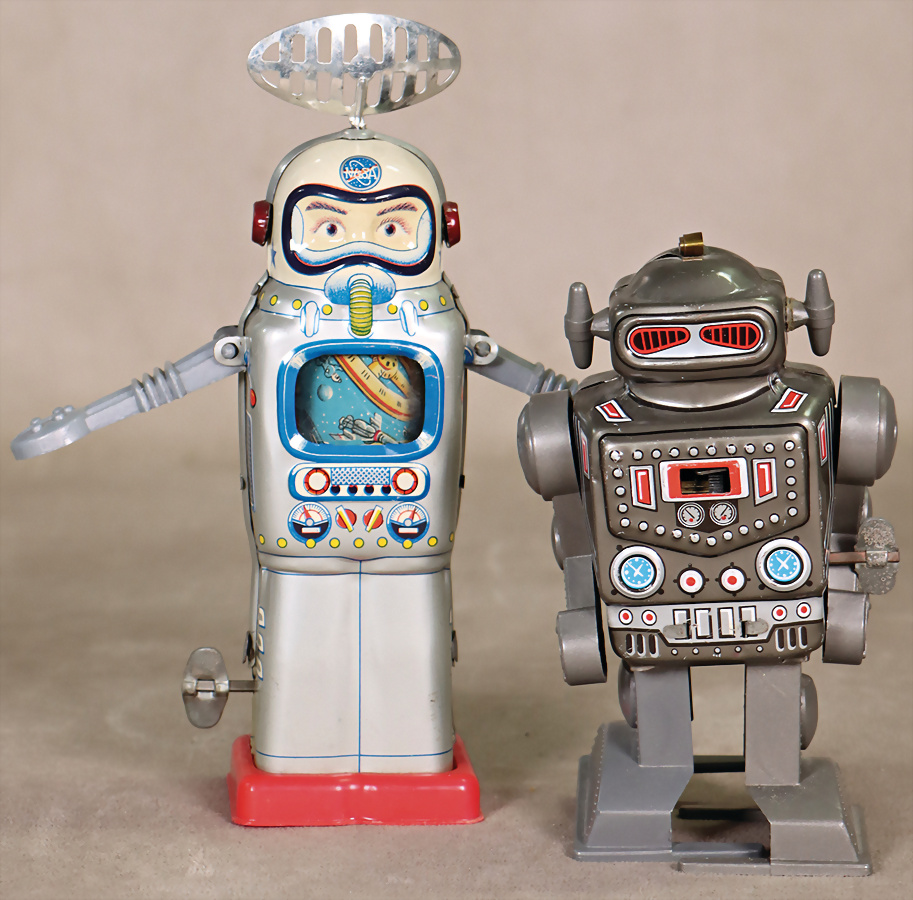 2 Art., „Astroman“ / „Space Man, with Rotating Antenna“ Blech, mit Uhrwerk, Uhrwerk intakt, guter Zustand, H: 18,5 cm Blech Litho., 70er Jahre, Yone „Robot No. 2121“ – Wind-Up Tin Robot, Blech, Kunststoff, litho, mit Uhrwerk, Uhrwerk intakt, min., Kratzer, sonst gut, 70er Jahre, 14 cm