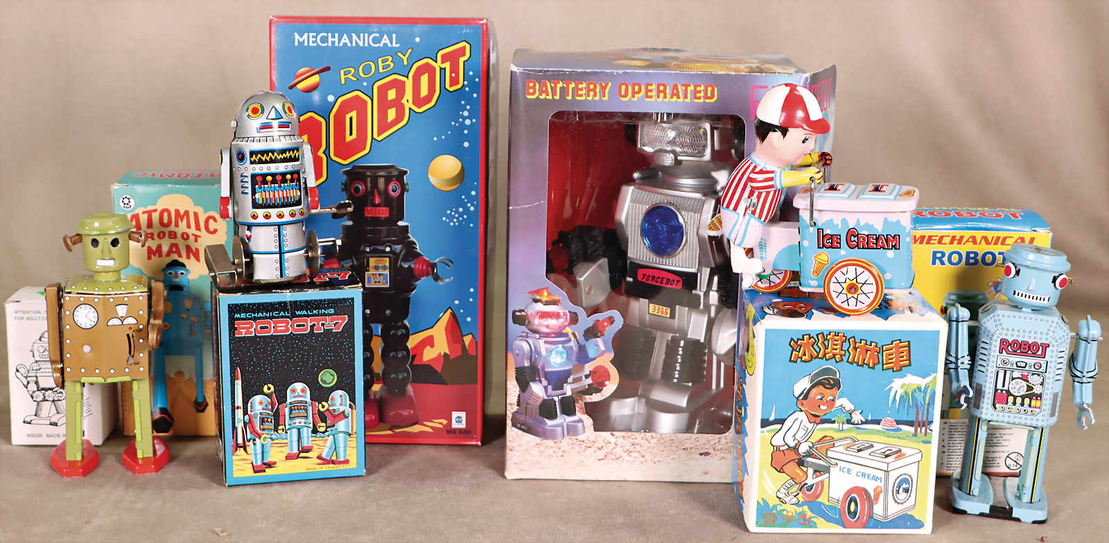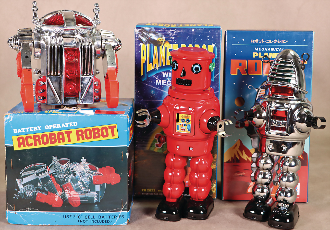3 Art., div., Roboter, im Originalkarton, Planet Robot Mechanical, MS -430, Planet Robot, Wind-Up, TR 2022, Made in China, Acrobat Robot, Batterie betrieben, an einigen Stellen fleckig, auf Funktion nicht geprüft, im Originalkarton, Karton teils verschlissen