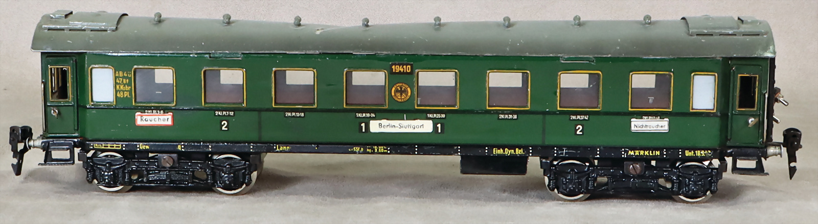 Spur 0, 1941, 4-achsiger Personenwagen 1. u. 2. Kl., 40 cm, deutliche Druckstelle am Dach, sonst leicht bespielt-guter Zust.