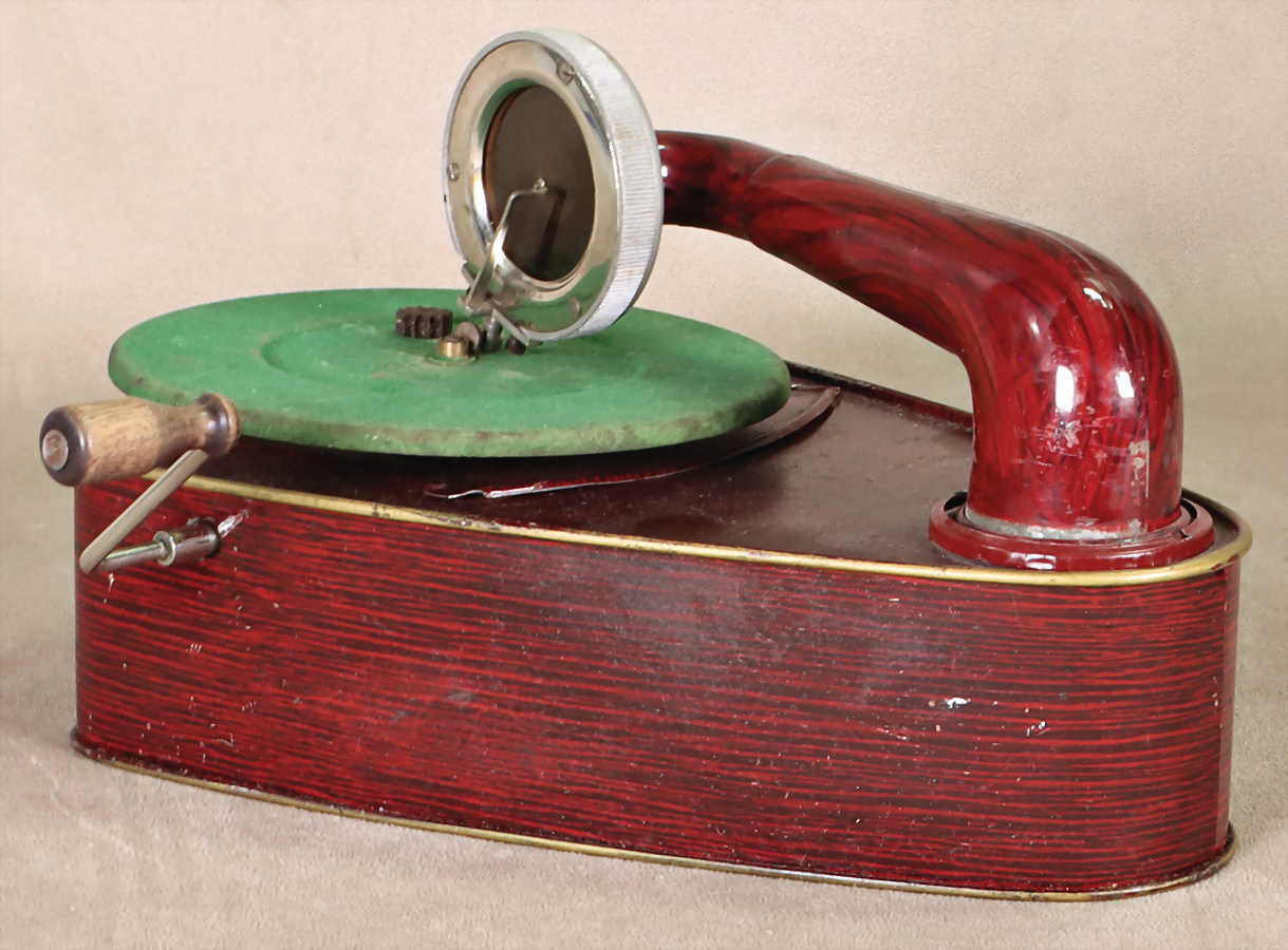 Bingular III, Kindergrammophon, Blech. lithogr., L:25,5 cm, ohne Nadel, Uhrwerk klemmt