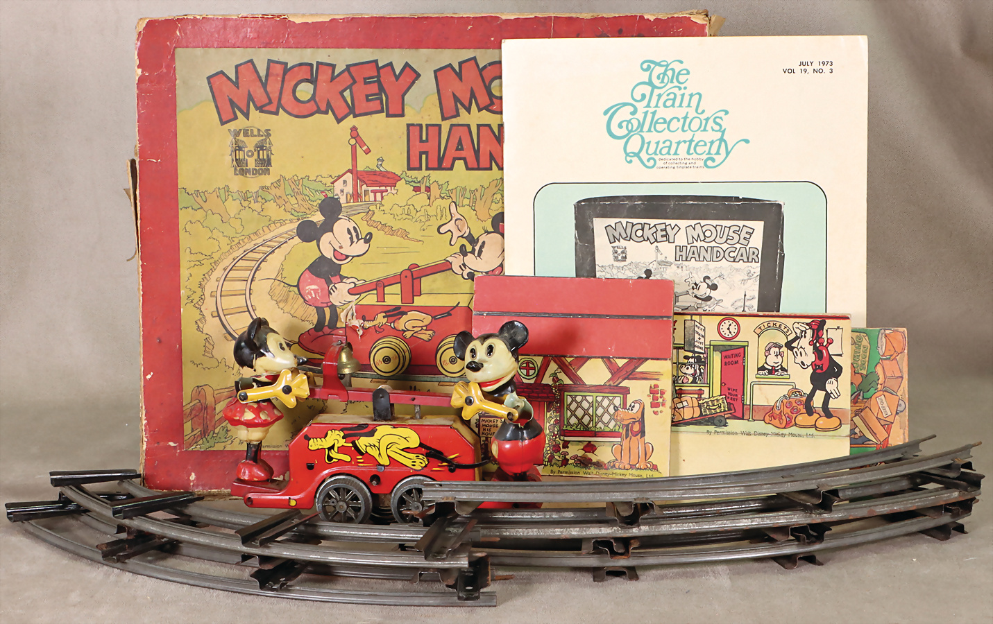 Micky Mouse, Handcar, Wells, London, England, Draisine, Blech lithogr., passend zu Spur 0, Uhrwerk intakt, Celluloid-Köpfe der Micky Mäuse weggebrochen, teilw. Rumpf beschädigt, im Orig.-Kart., Kart. stärker verschlissen