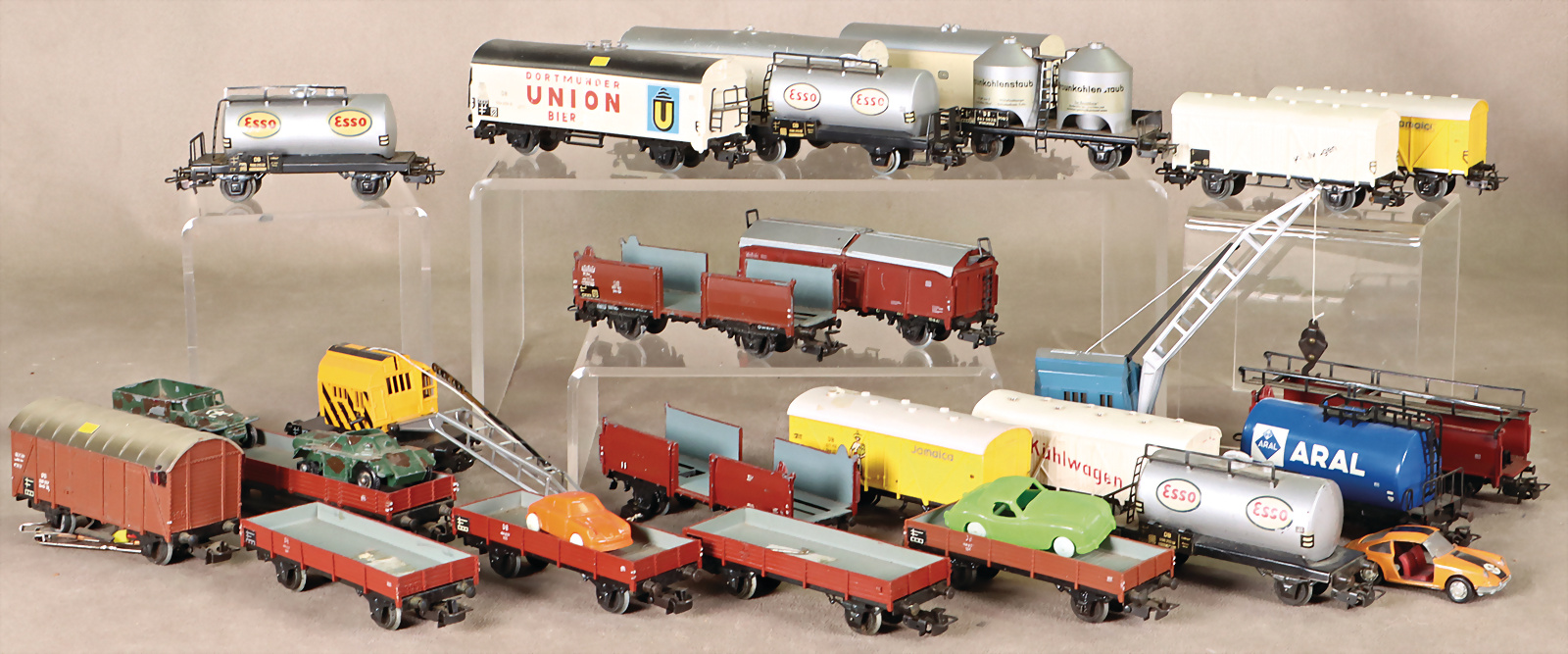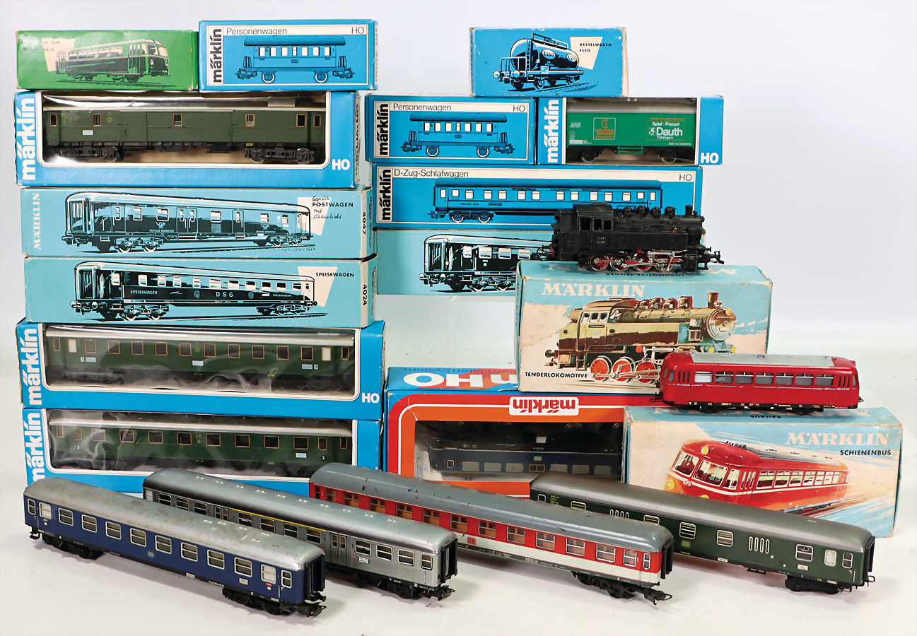 Konv. H0, Güter- u. Personenwagen, teils bespielt, teils im Kart., 1 Schienenbus 3016, mit Anhänger, Tender-Lok, 3032, Guss, Elektro-Lok, 3039, bespielt, im Kart.