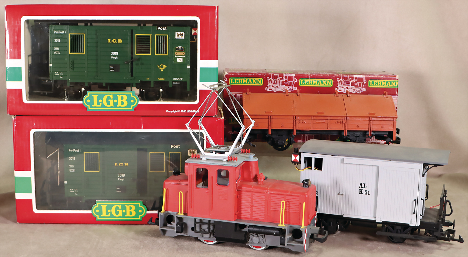 2x 3019 Postwagen, Elektro-Rangier-Lok, 2060, ohne Kart., bespielt, Güterwagen, 4011, im Orig.-Kart., Gepäckwagen, grau, guter Zust.