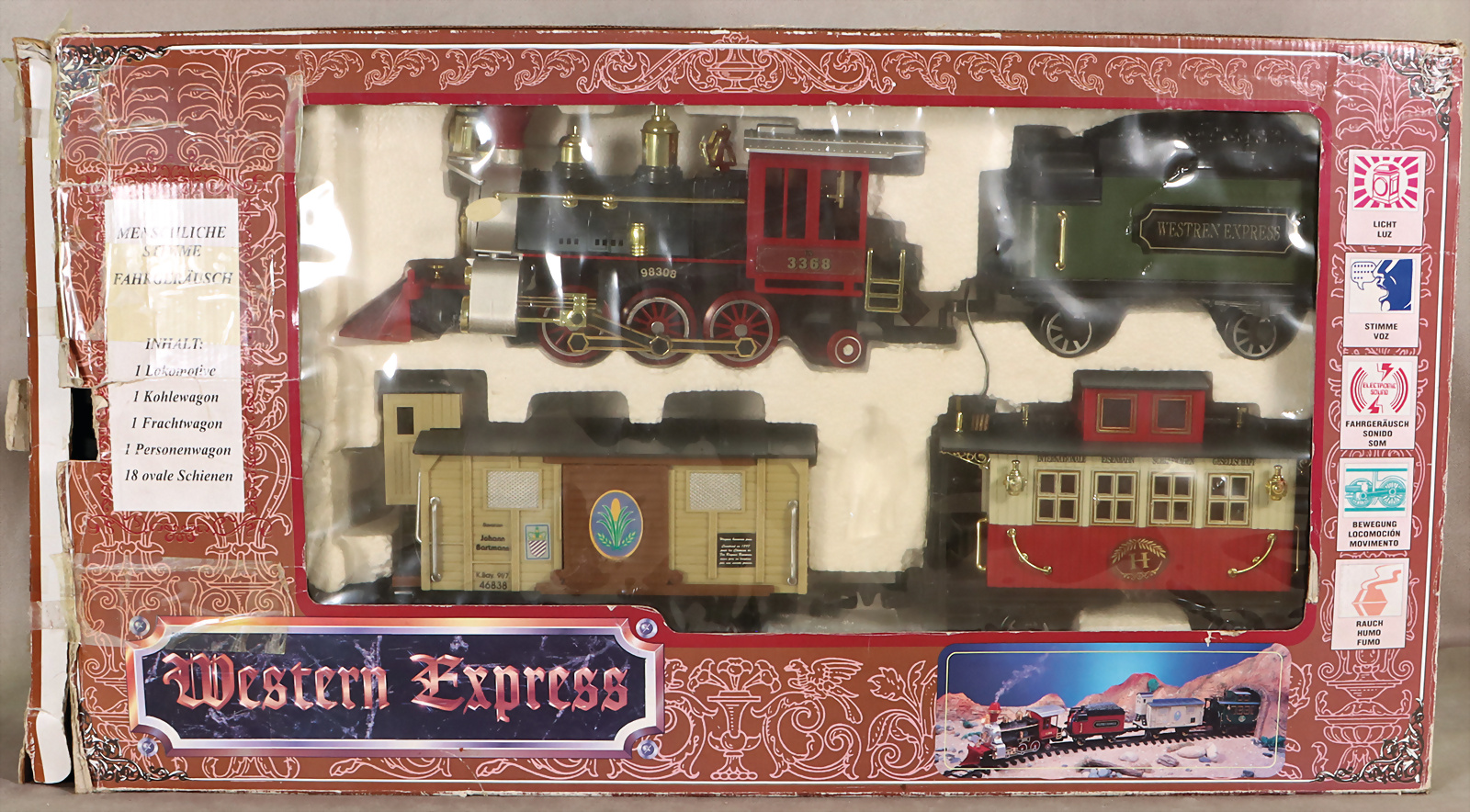 Spur 1, passend für LEHMANN Western Express, Schlepptender-Lok C, menschliche Stimme mit Fahrgeräusch, im Orig.-Kart., techn. nicht geprüft, optisch guter Zust.