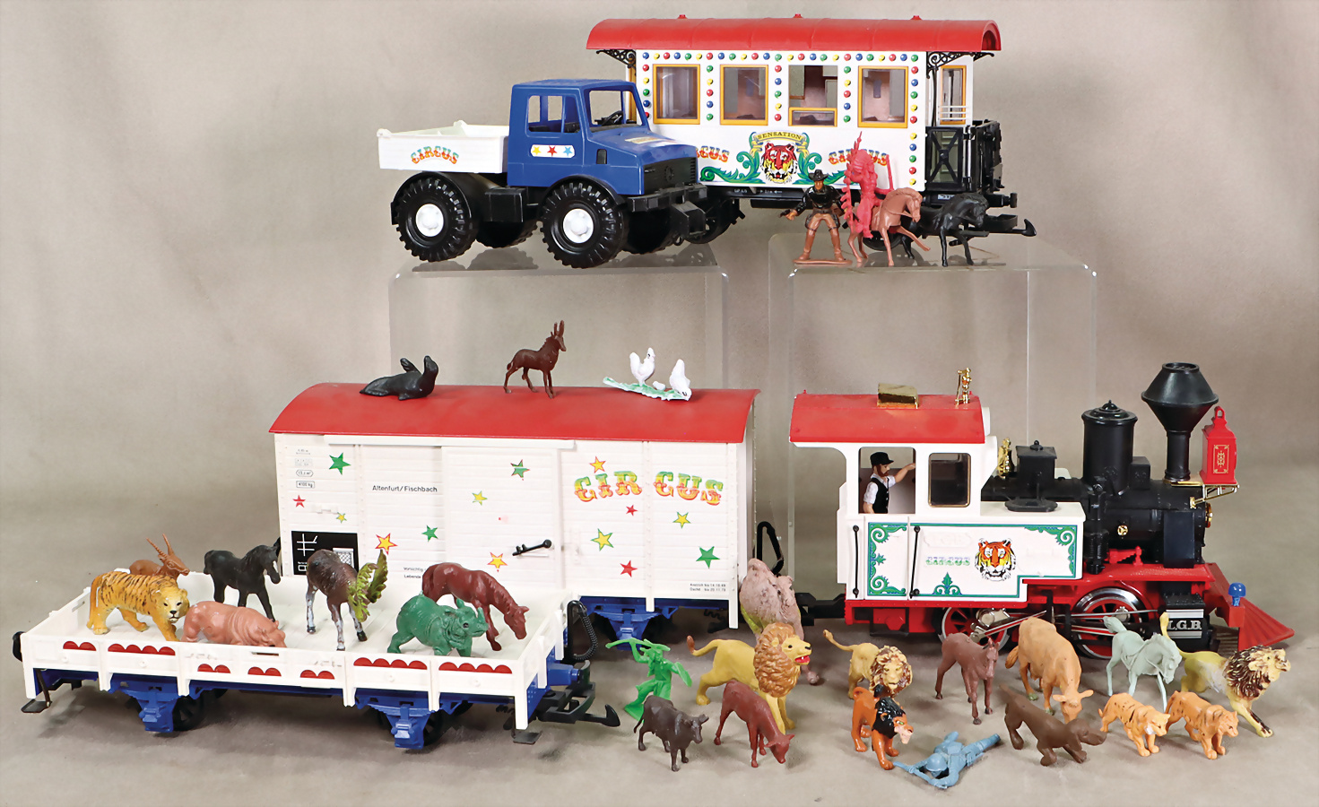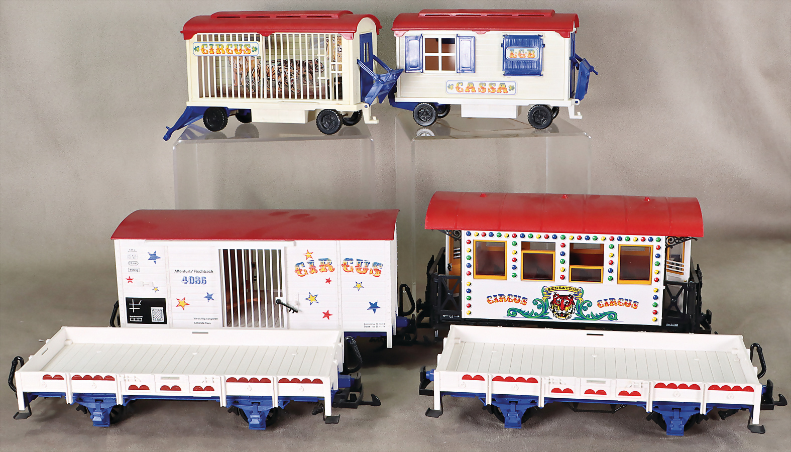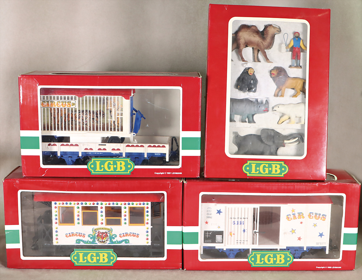4 Teile, Zirkus-Tierwagen, Zirkus-Personenwagen mit Inneneinrichtung, 2 Zirkus-Güterwagen mit Zirkuswagen beladen, guter Zust., leicht bespielt