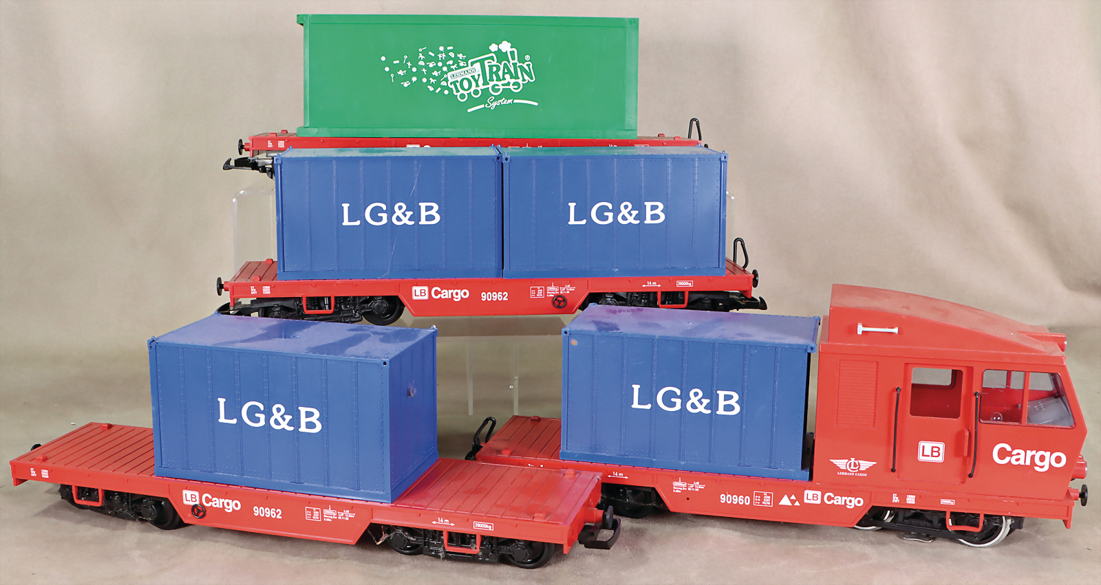 Cargo Container Rangier-Lok, 4-achsig, 3 Container-Wagen, einige Container teils ohne Türen, bespielt, techn. nicht geprüft, optisch gut