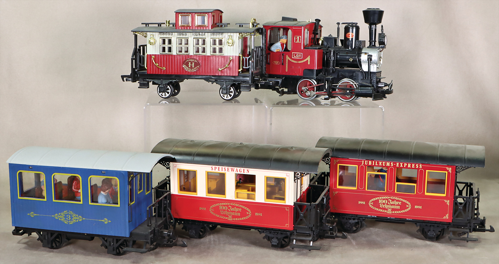 kl. Dampf-Lok, rot, 4 Personenwagen, bespielt, gut, techn. nicht geprüft