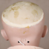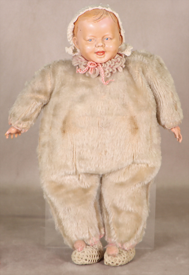 Googly, Ganzbiskuit, 16 cm, fester Kopf, seitl. blickende Schlafaugen, geschl. Melonen-Mund, Beine restauriert, Orig.-Mohair-Perücke, ausgegangen, kl. Wachspuppe, sitzend, seitl. blickende gemalte Augen, geschl. Mund, 1 Hand bestoßen