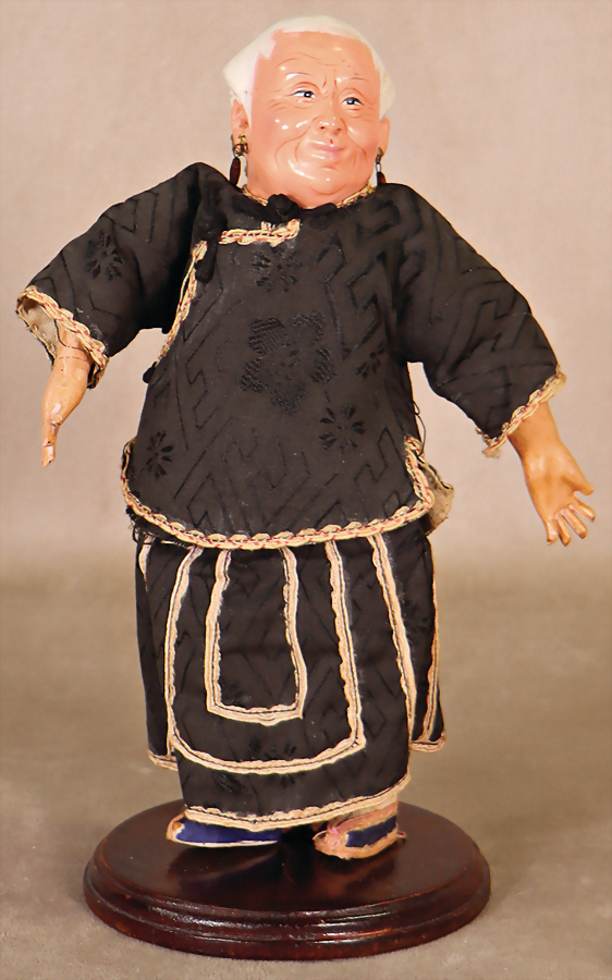 Masse Einbindekopfpuppe, Chinese, 25 cm, Stoffkopf, Masse-Arme, ein paar Finger geklebt, Spannungsriss an 1 Hand, Orig.-Kleidung, schöne Puppe für einen Kolonialwarenladen