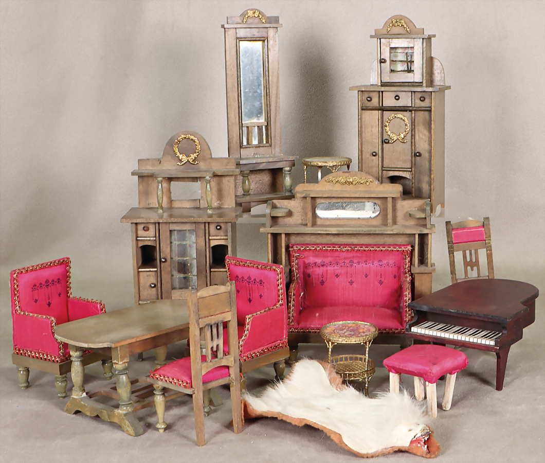 Puppenstuben-Möbel, Jugendstil, Sitzgruppe, 2 Schränke, H: 17 u. 18 cm, Sitzgruppe, Flügel, Bärenfell, Kleinteile