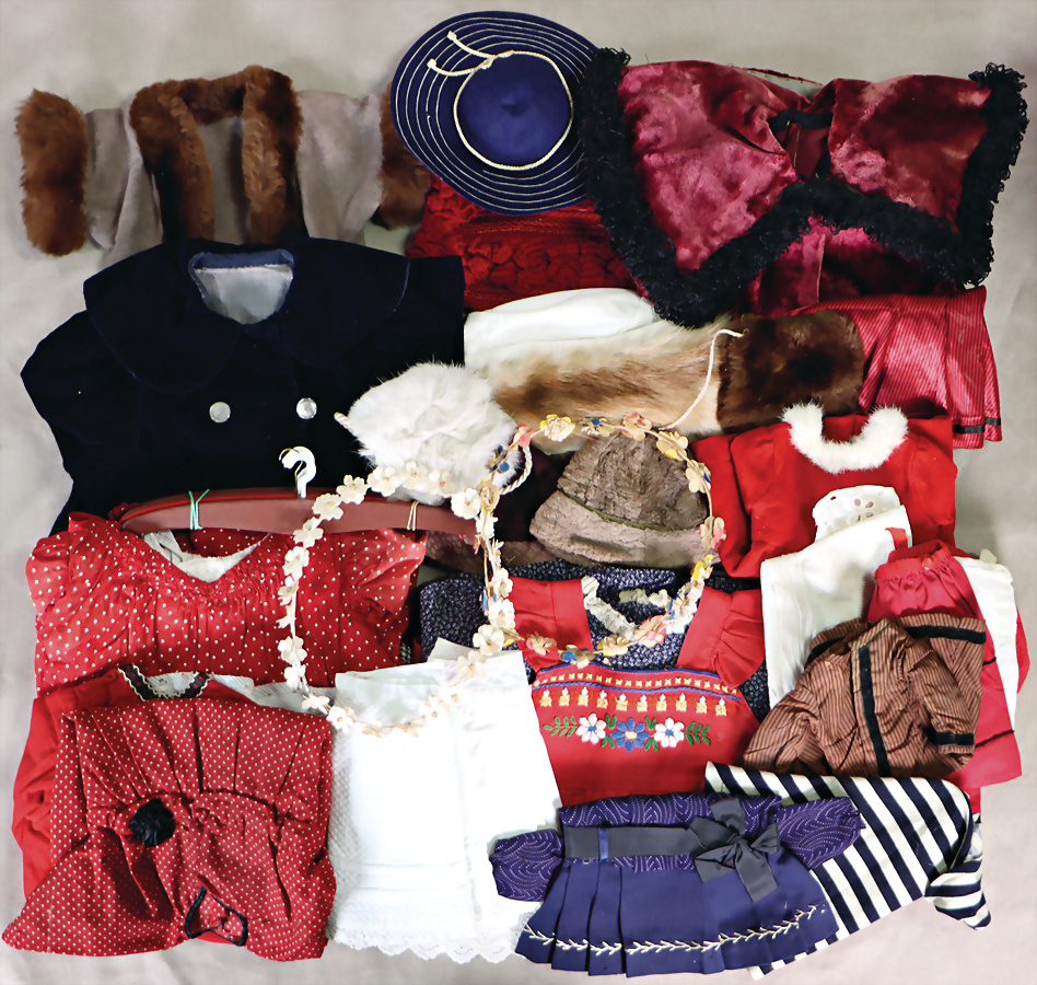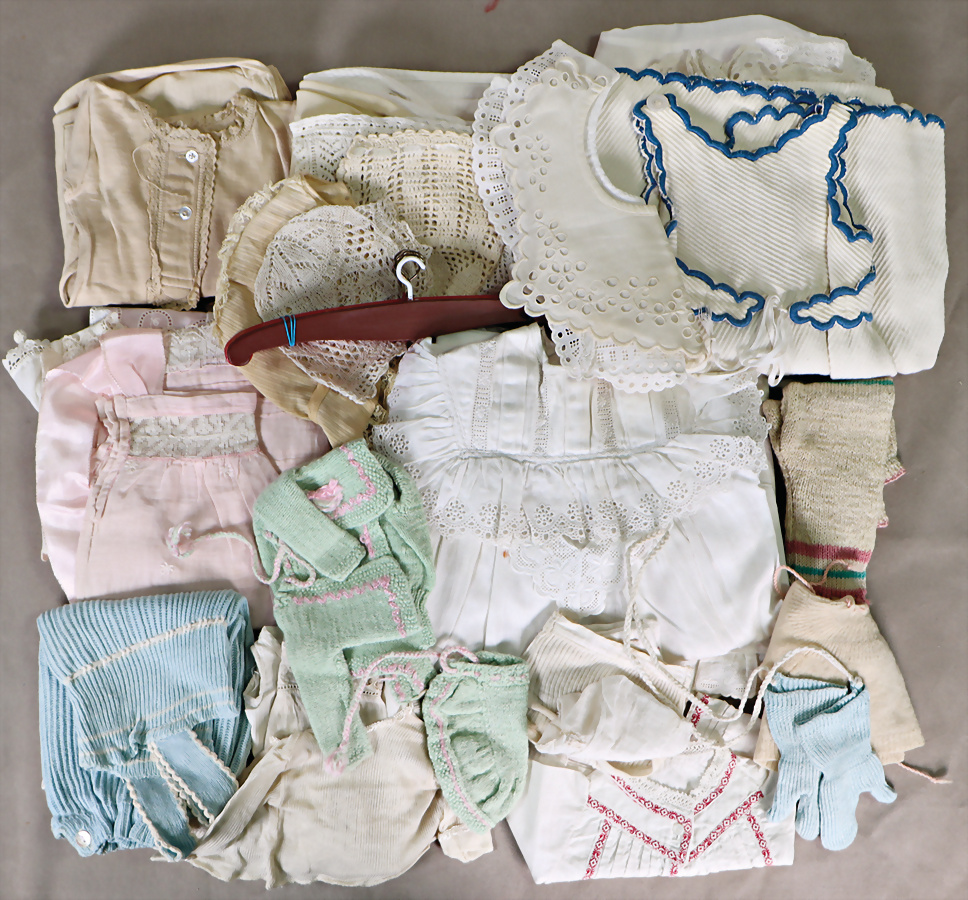 Konv. Puppenkleidung, 1910-40, Hauben, Weißwäsche, Kragen, gestrickte Kleidung, untersch. Gr.