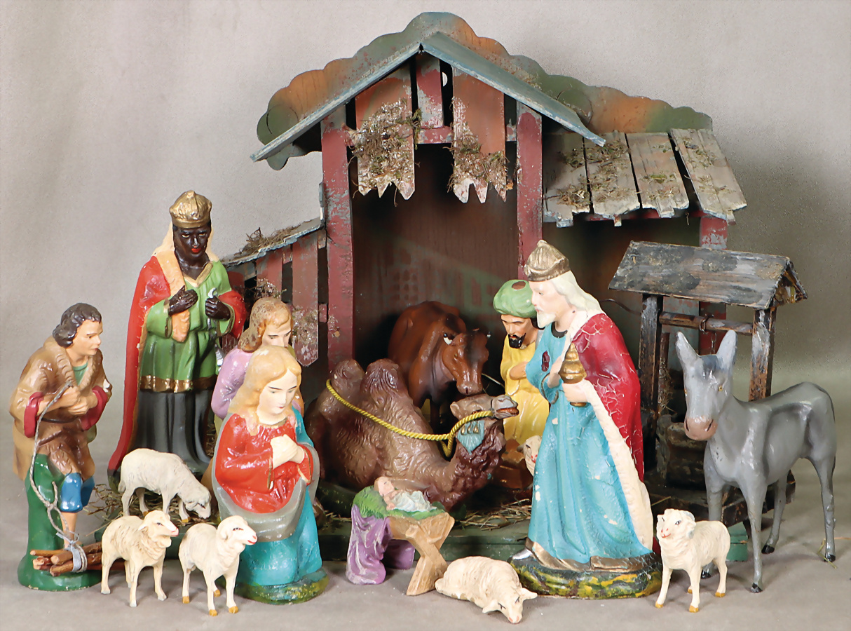 Krippe, Holz, farbig gefasst, mit Masse-Figuren, Figuren H: 14 cm