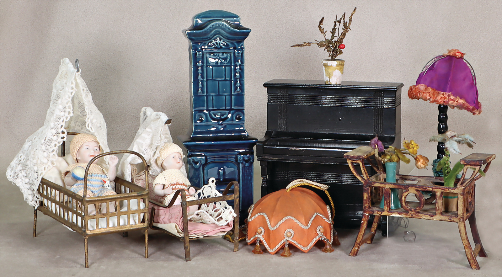 Puppenstuben-Ausschmückungsteile, Keramikofen, H: 22,5 cm, Porzellan, Kind mit anmodelliertem Ball in der Hand, kl. Ganzbiskuit-Puppe, Blumenbank, 2 Lampen
