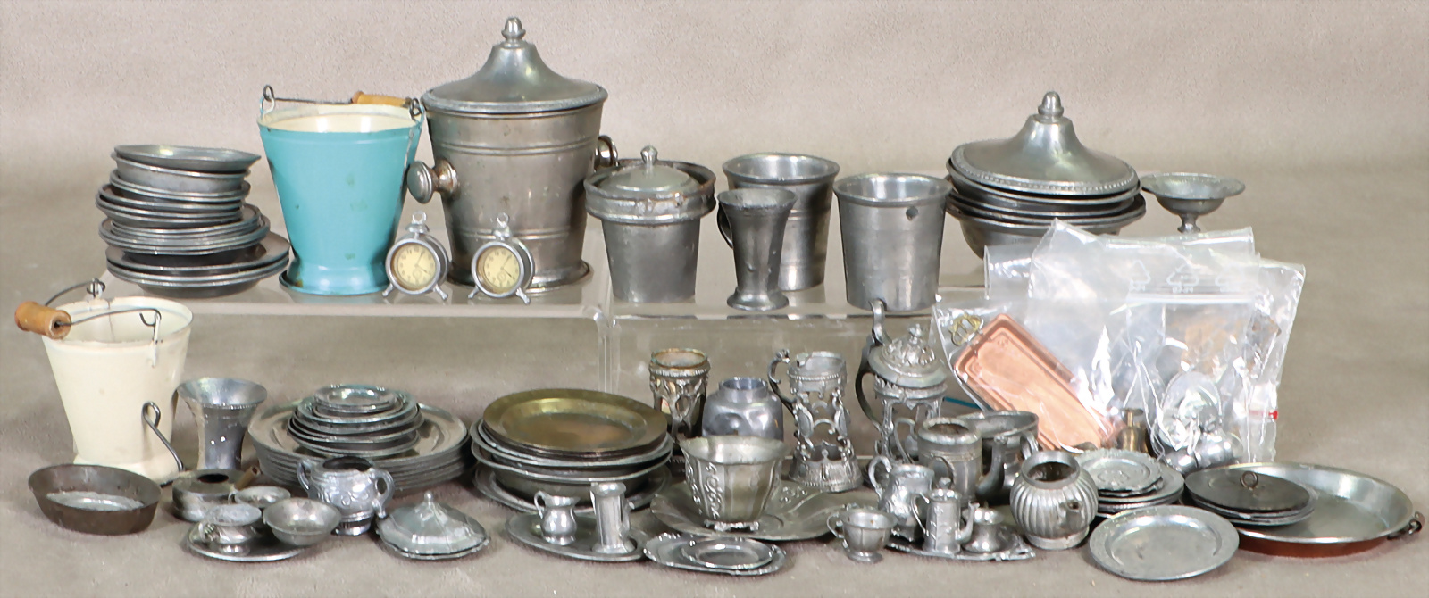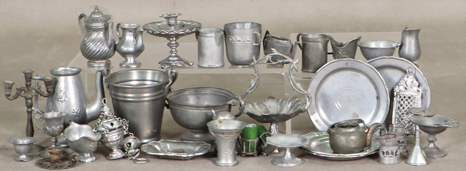 Konv. Puppenstuben-Zinnteile, Schalen, Krüge, Eimer, Teller, Kerzenhalter
