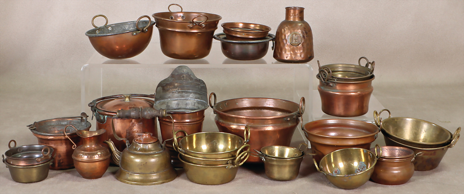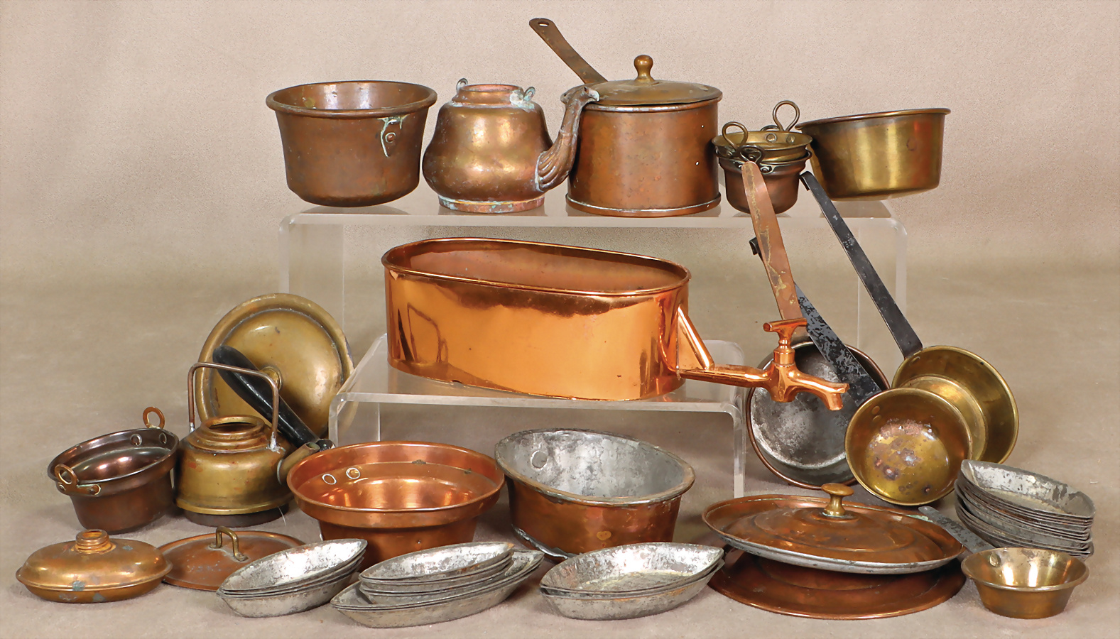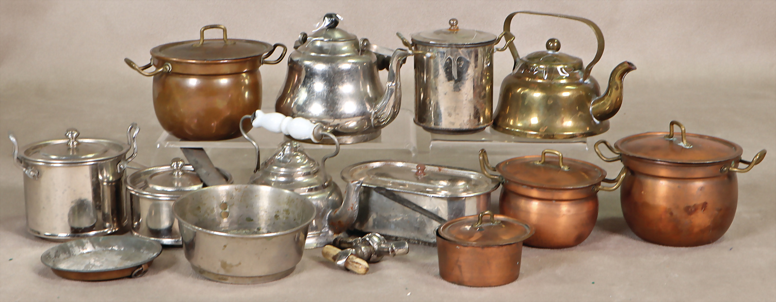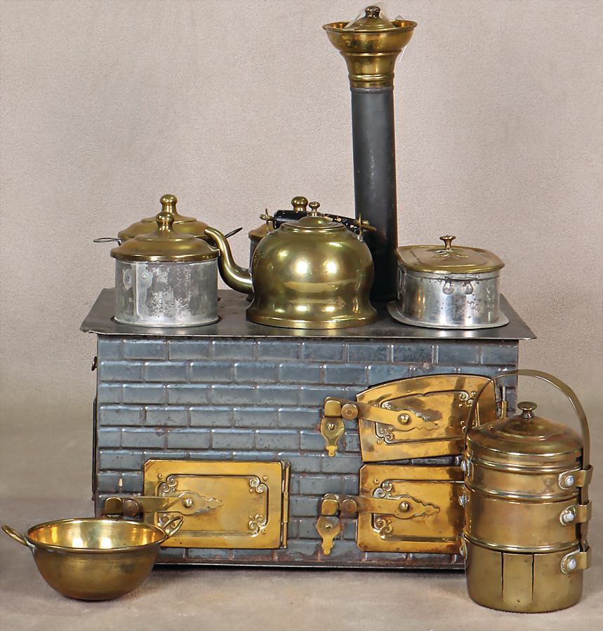 Konv. Puppenküchenteile, Kupfertöpfe, innen verzinnt, mit Deckel, Hersteller BING, gem., 1 Topfsatz Weißblech, Wasserschiff, B: 9 cm, Innenmaß 7,8 cm, Wasserkessel, 3 Töpfe, Topfpfanne, Wasserkessel mit Porzellangriff, 1 Hahn für Wasserschiff