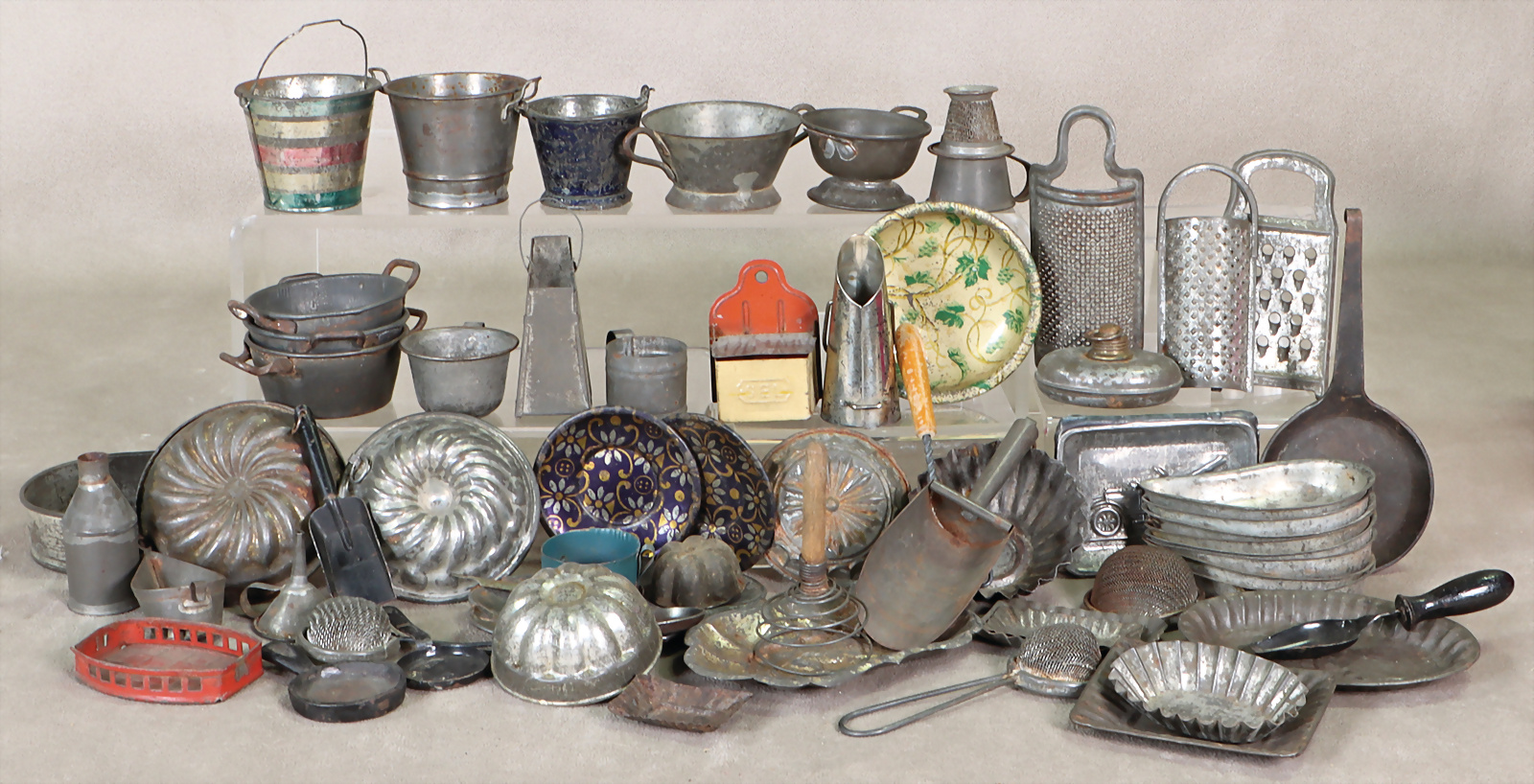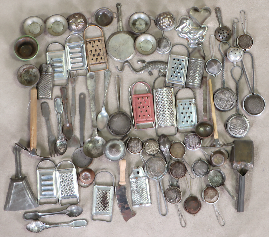 Puppenküchen-Weißblechteile, Backform, Töpfe, Sieb, Reibe, Kleinteile, kl. u. mittlere Gr., reichh.