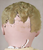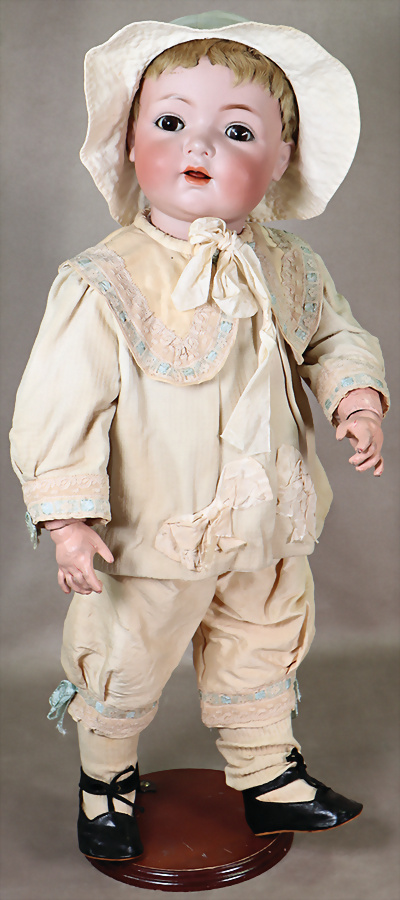 121, Porzellan-Charakter-Puppe, 66 cm, Kopfmarkierung 62, Größenunterschied aufgrund des Toddlerkörpers, braune Schlafaugen, 1 Zahn (1 Zahn fehlt), Kinn- u. Backengrübchen, Hände übermalt, Orig-Fellperücke wurde nicht entfernt