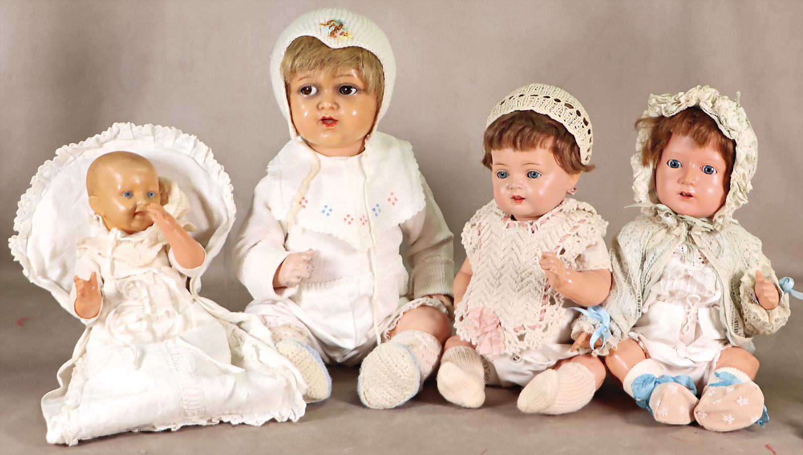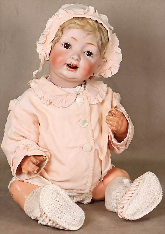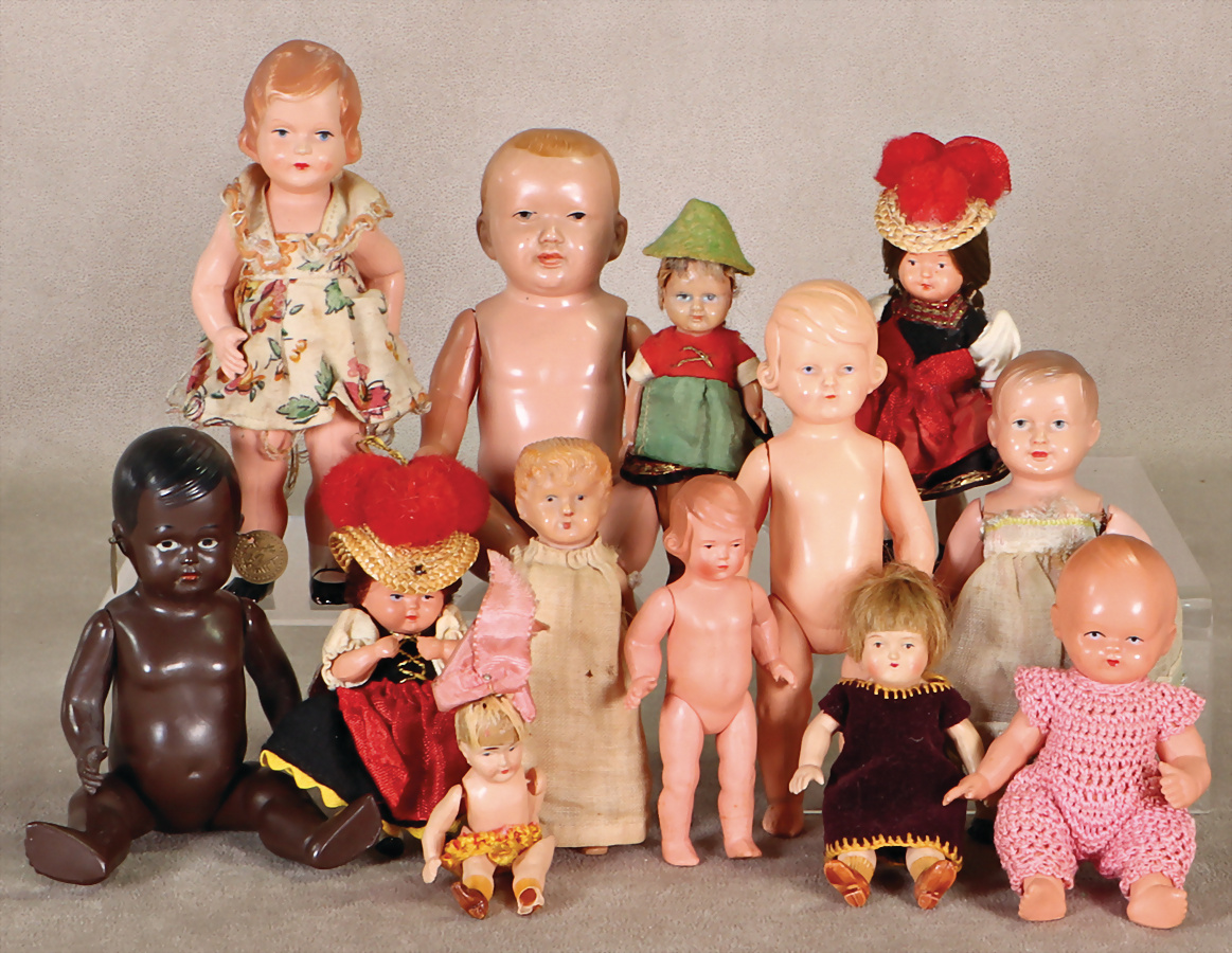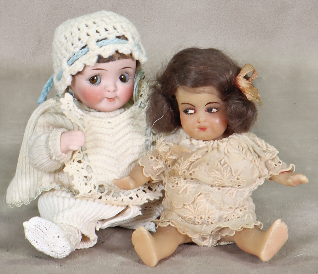 SCHILDRÖT, Klein Ella, ca. 1930, 40 cm, blaue fest einges. Glasaugen, off. Mund, Mohair-Perücke, aufgeklebt, Kopf wohl restauriert, KESTNER, Celluloid, gem. 203, ca. 1920, Baby, 29 cm, Kurbelkopf, blaue fest einges. Glasaugen, off./geschl. Mund, Farbabweichung zwischen Kopf u. Körper, selten, KÄMMER & REINHARDT 728, 47 cm, Kurbelkopf, braune Schelmenaugen, sitzen etw. schief, Kopf am Hinterkopf ausgebessert, Miblu, Kopfdeckel wurde nicht entfernt, Masse-Sitzbaby-Körper, KÄMMER & REINHARDT 128, 30 cm, Celluloid, blaue Schlafaugen, off. Mund, Zähne u. Zunge, Sitzbaby-Körper, Mohair-Perücke, Kopf restauriert, nur unter UV-Licht sichtbar