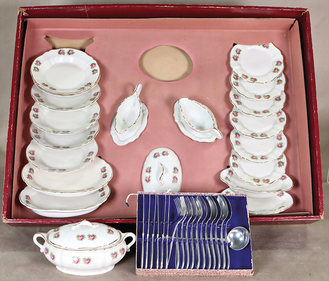 Kinder-Speiseservice, 6 Teller, D: 6 cm, flach, 6 Teller, D: 11 cm, tief, 2 Saucieren, 1 Suppenschüssel mit Deckel, 1 Suppenschüssel fehlt wohl, einige Platten, Besteckteile, Porzellan, Rosenmotiv, im Orig.-Kart.