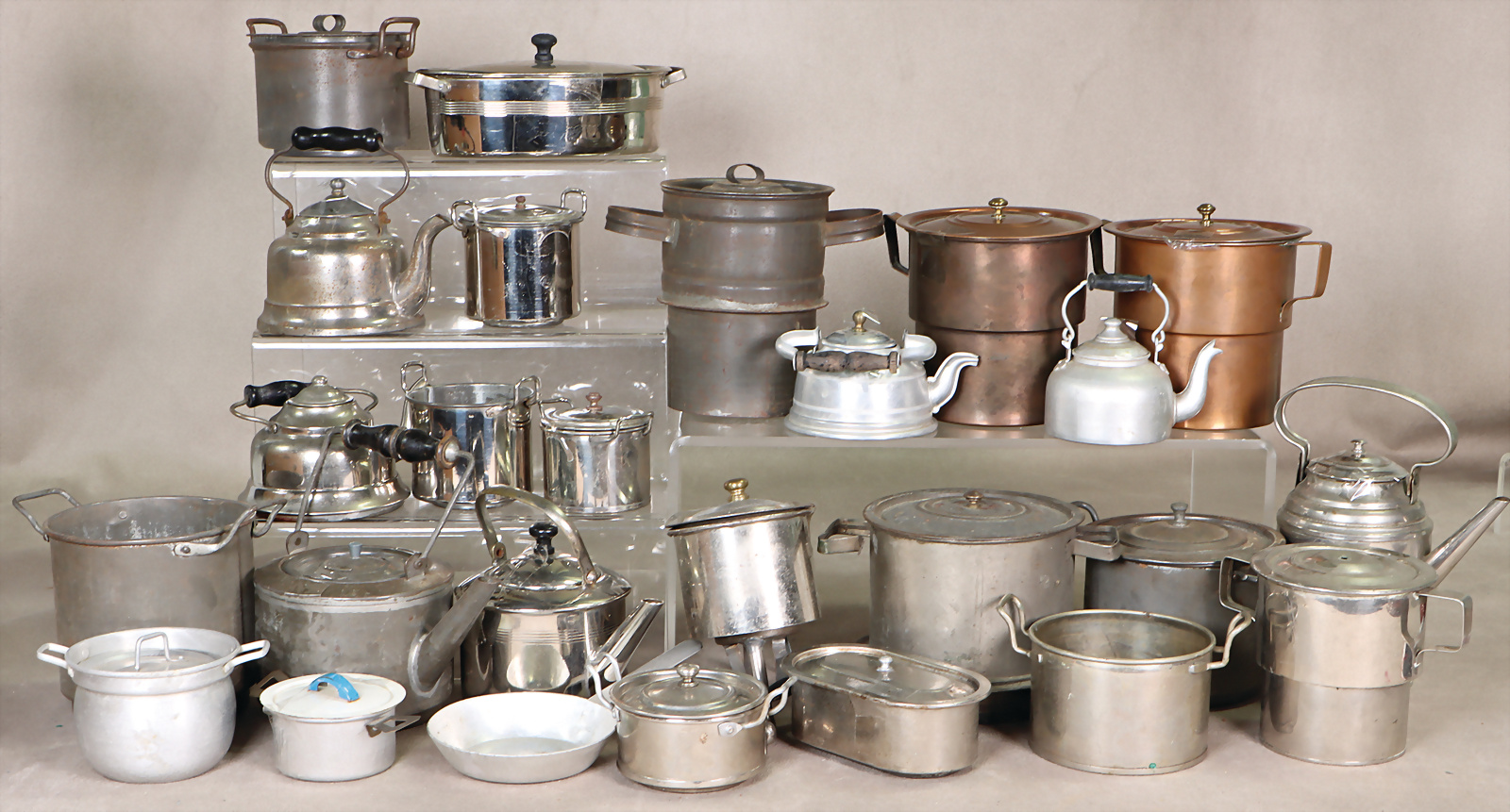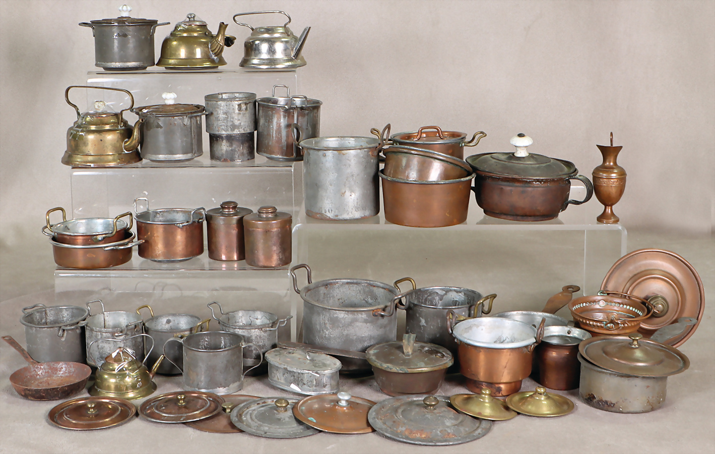 Gr. Konv. Töpfe für Puppenküchenherde, Kessel, Wasserkocher, einzelne Deckel, meist Weißblech, 2 Töpfe Kupfer, gr. Konv. einzelne Deckel