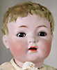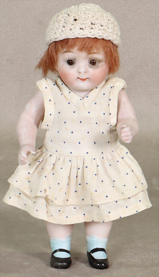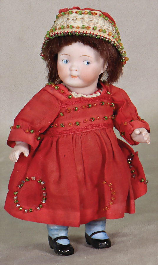 Ganzporzellan, Googly, gem. 217, 14,5 cm, fester Kopf, braune Schlafaugen, geschl. Melonen-Mund, bewegl. Arme u. Beine, anmodell. Schuhe u. Strümpfe, Perücke neuer
