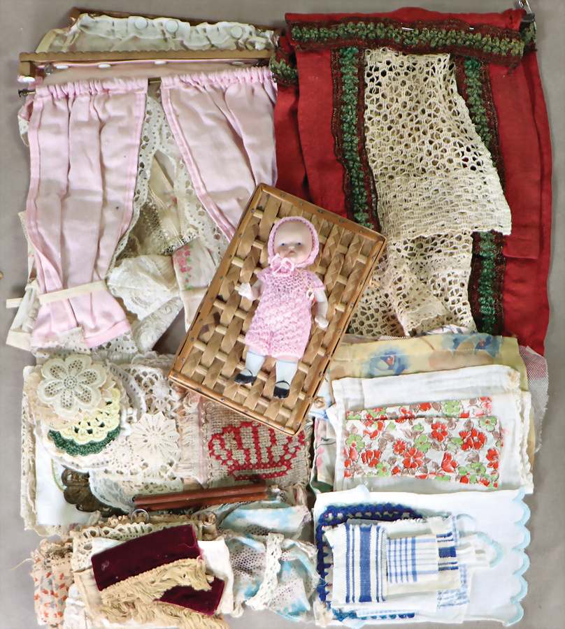 Div. Gardinen, Gardinenstangen, Decken, teilw. gestickt, kl. Ganzbiskuit-Puppe, 12,5 cm, Kurbelkopf, gemalte Augen