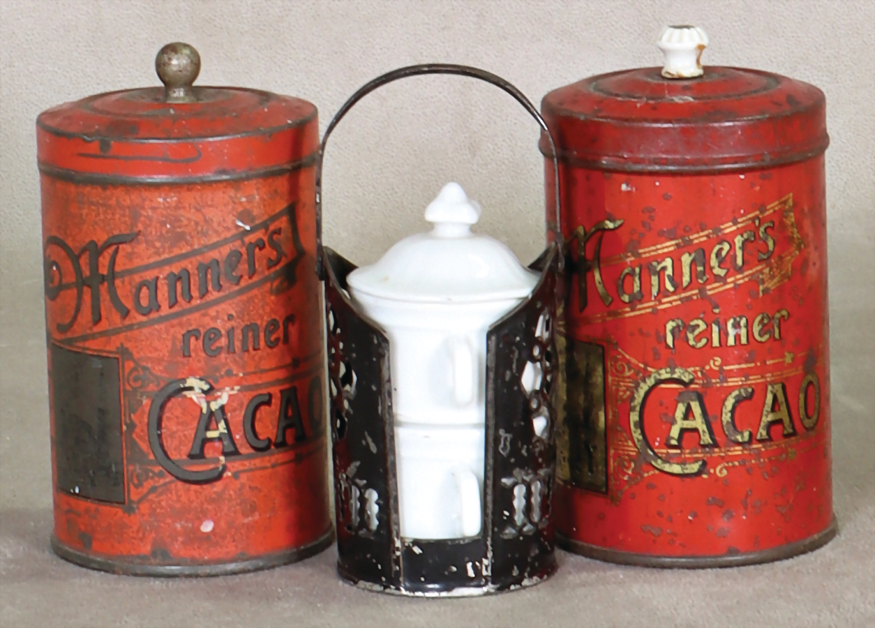 Essensträger, H: 10,5 cm, 2 Dosen, Blech, lithogr., 10,5 cm, 1x Metallknauf, 1x Porzellanknauf, Litho angelaufen