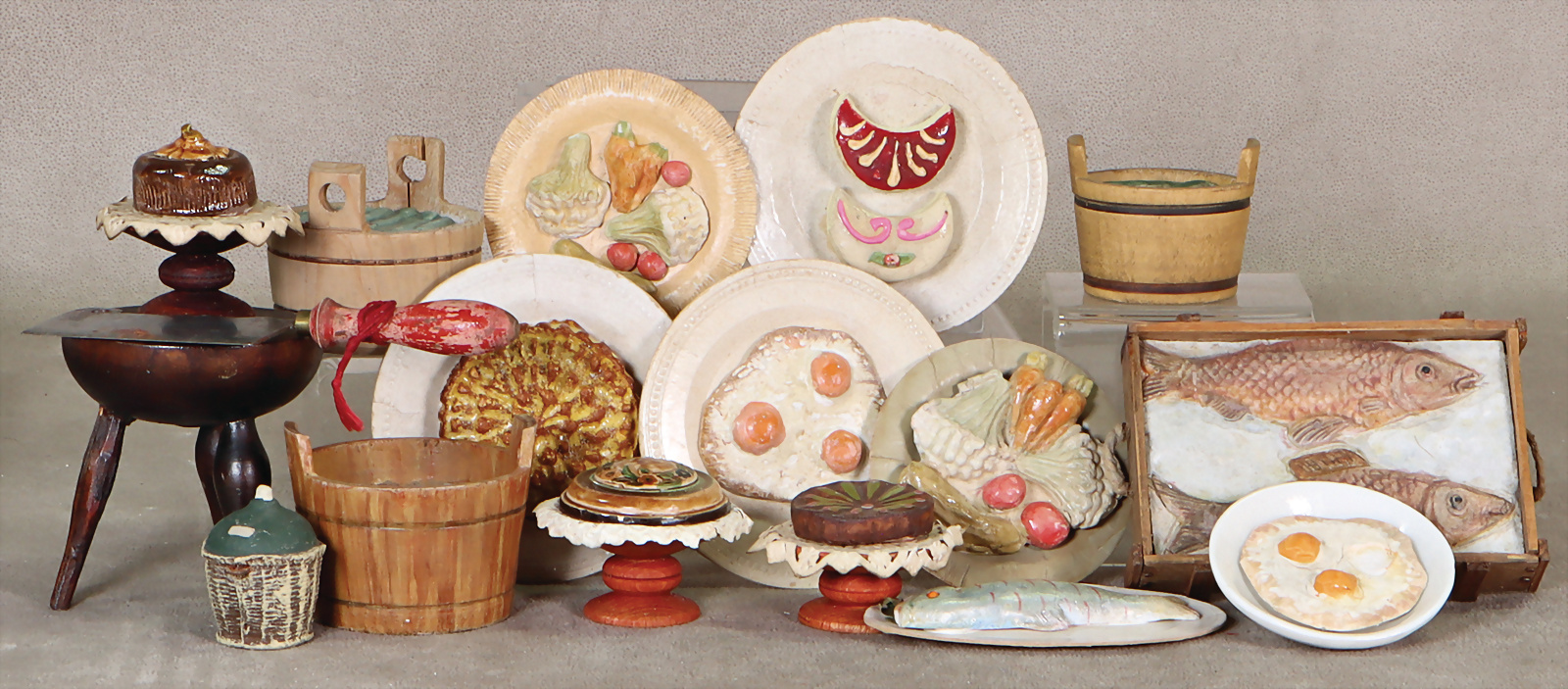 Konv. Puppenstuben- oder Kaufladenzubehör, Fässer, Behälter mit Fisch, 1 Hackklotz, schönes Konv.