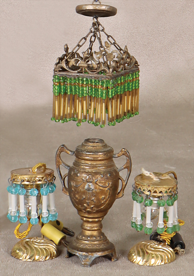 Messingblech, vergoldet, Glasperlen montiert, 2 Tischleuchter, H: 5,5 cm, 1 Zinnkaraffe ohne Aufsatz, 1 Deckenleuchter Zinn, Glasperlen montiert