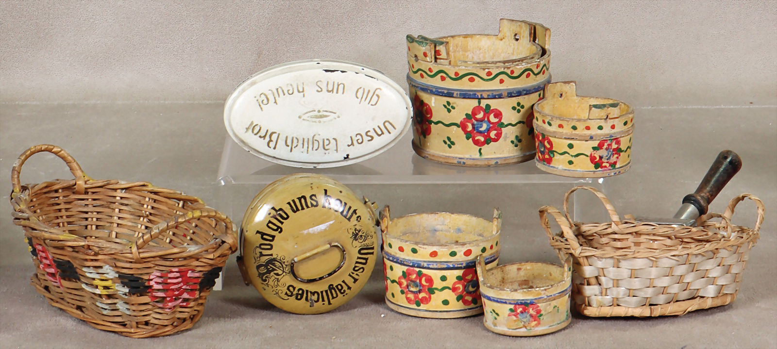 Puppenstuben-Ausschmückungsteile, Holzfässer, bemalt, H: 3-5,5 cm, Körbe, Schieber, 2 Brotdosen