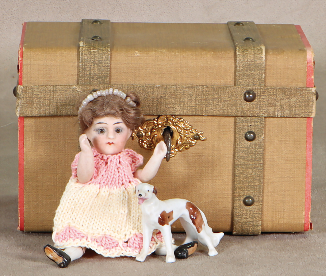 Kl. Trousseau-Koffer, mit Einsatz, B: 13,5 cm, kl. Ganzporzellan-Puppe, 10 cm, 1 Windhund, Porzellan