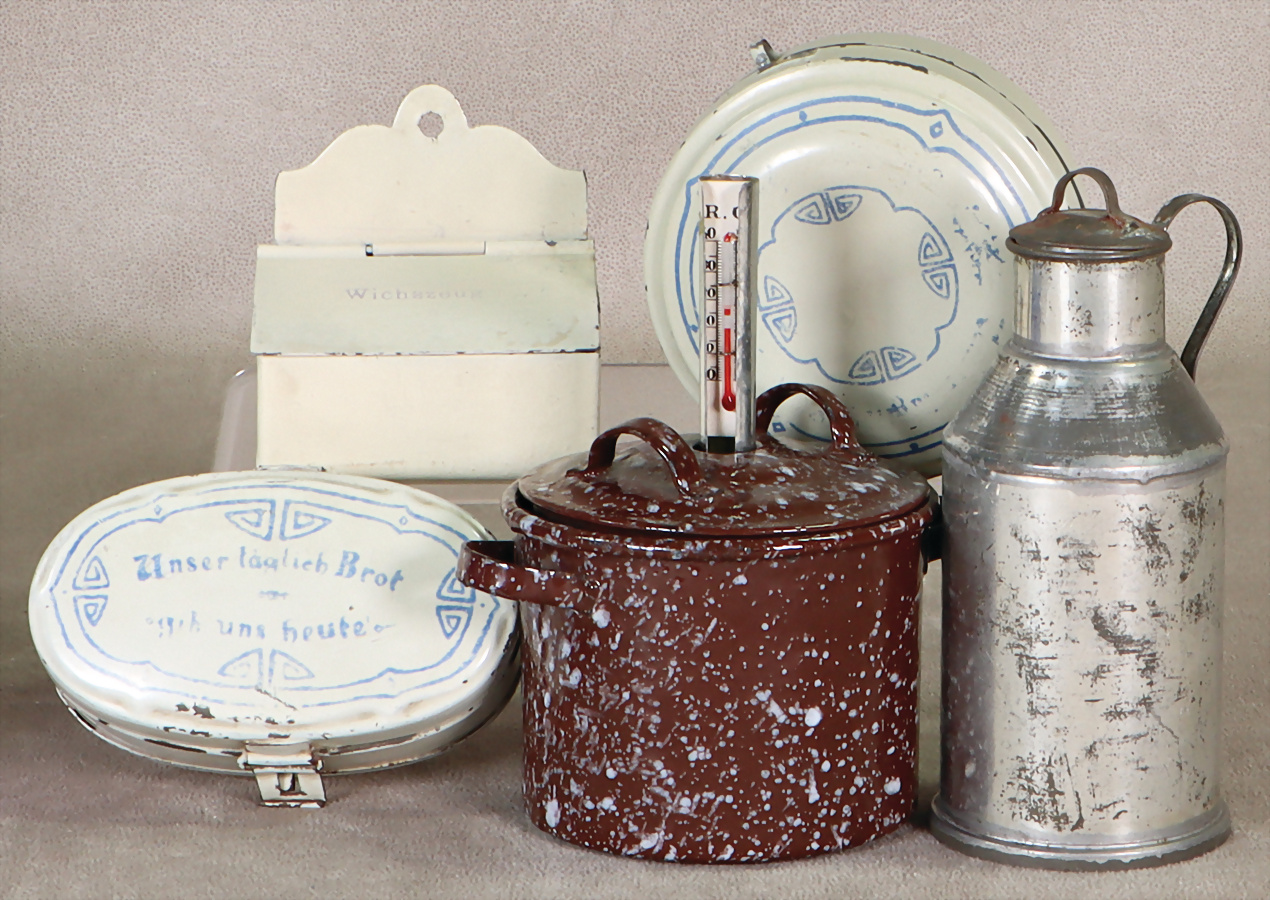 Konv. Puppenküchen-Ausschmückungsteile, Milchkanne, Weißblech, 11,5 cm, 1 Einmachtopf mit Thermometer u. 2 Gläsern, Brotdosen, Schatulle für Wichszeug