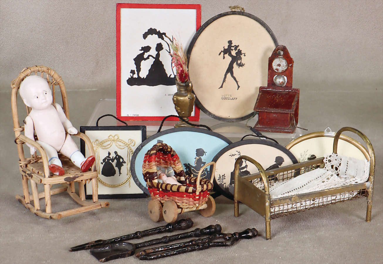 Konv. Puppenstuben-Ausschmückungsteile, kl. Bett, 8,5 cm, 6 Puppenstuben-Bilder, Porzellan-Kind im Schaukelstuhl, kl. Wiege mit Ganzporzellan-Kind, Telefon